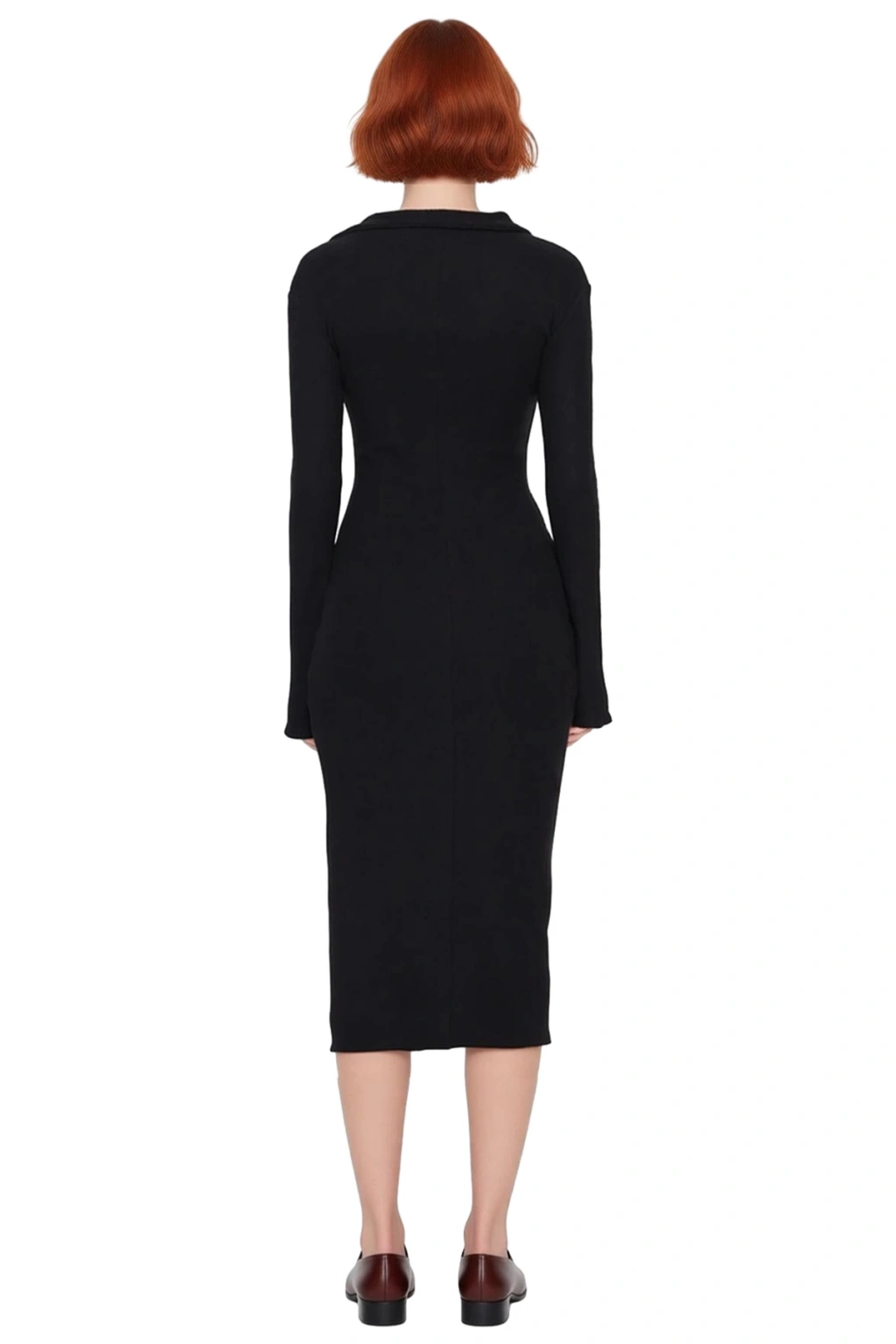 Ürün Özellikleri: Bodycon kalıp, polyester karışımlı materyal, düz desen, polo yaka, standart kol, fırçalı rejenere kaşkorse kumaş, siyah renk.