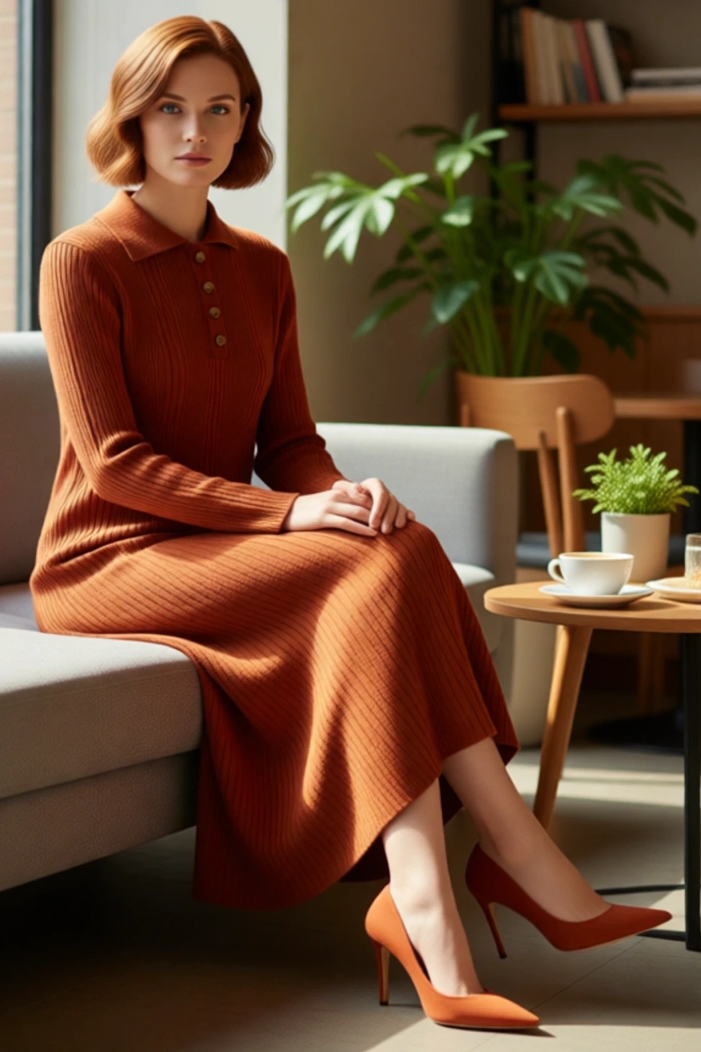 Ürün Özellikleri: A-line kalıp, akrilik materyal, düz desen, polo yaka, takma kol, triko kumaş, kiremit renk.