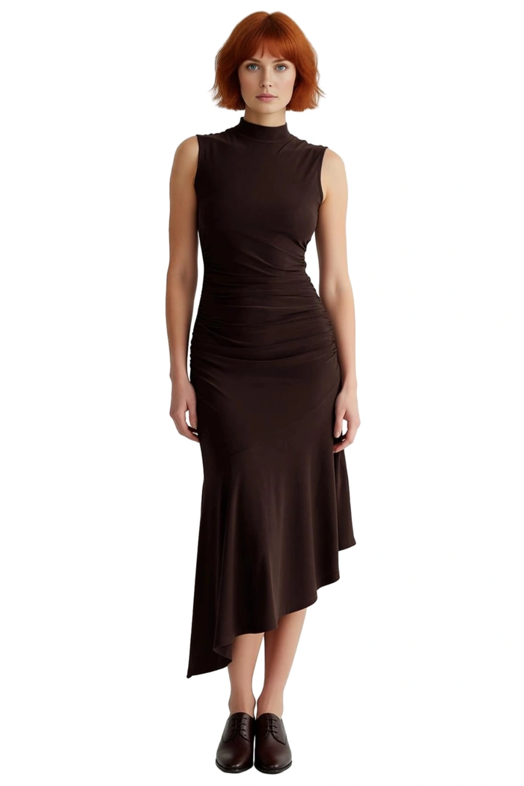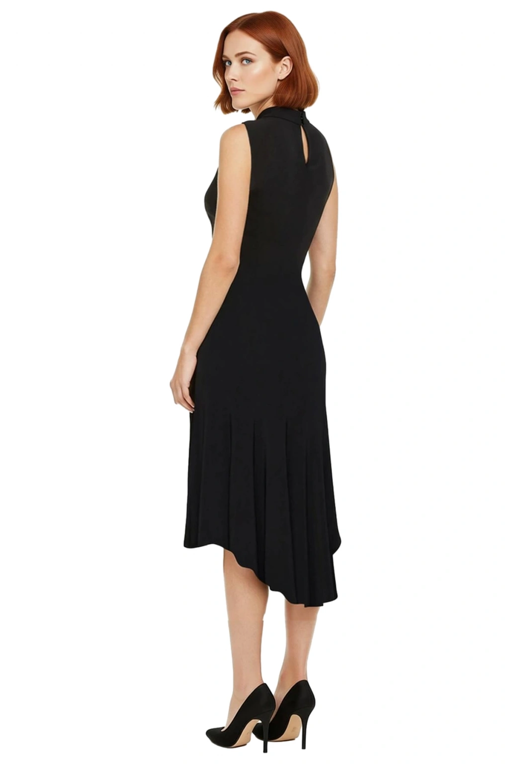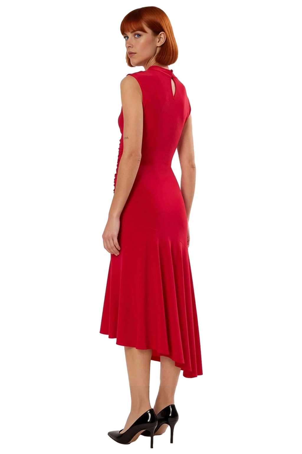 Asil dik yaka tasarımı, boynunuzu zarifçe sararak modern bir şıklık sunar. Kolsuz yapısı, özellikle sıcak havalarda veya kapalı mekan davetlerinde rahatlık sağlarken, stilinize çekici bir hava katar. Sandy dokuya sahip örme kumaş, cildinize yumuşak bir dokunuş sunar ve gün boyu nefes alabilen yapısıyla ferahlık hissi verir. Astarsız tasarımı hafiflik sağlarken, esnek yapısı hareket kabiliyetinizi artırır. Bu elbise, özel günlerde kolayca şıklığı yakalamanız için tasarlanmış olup bakımı da oldukça pratiktir.