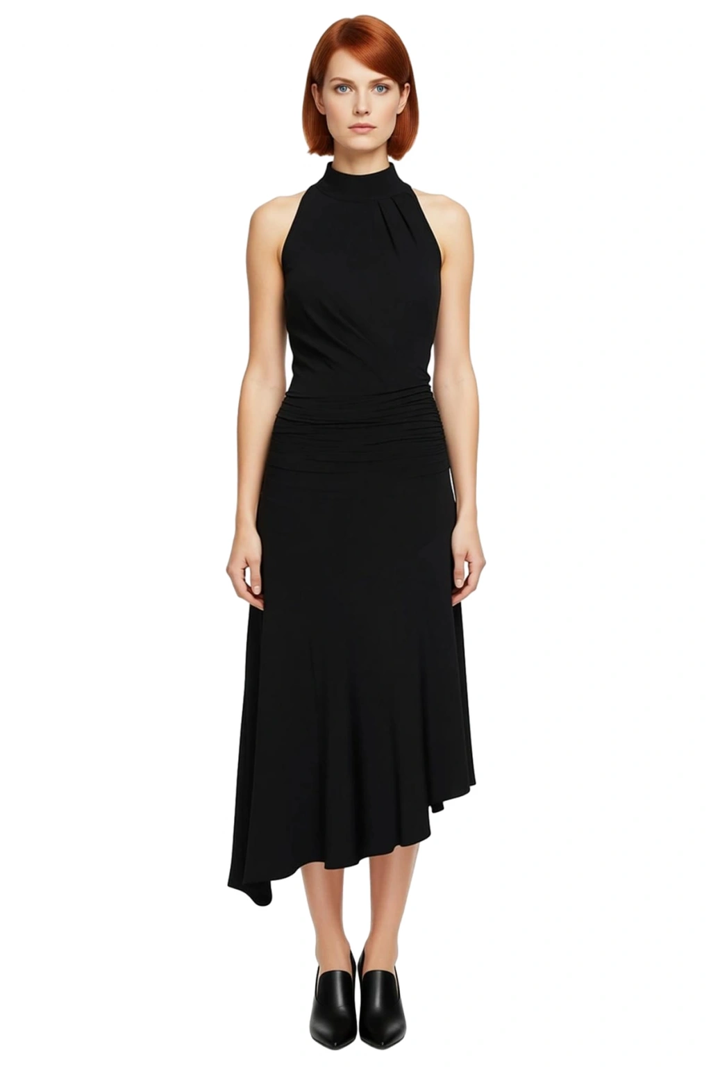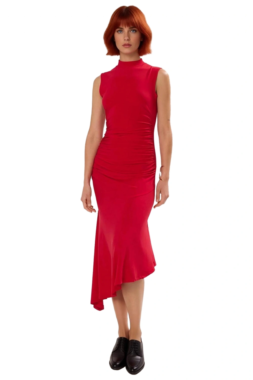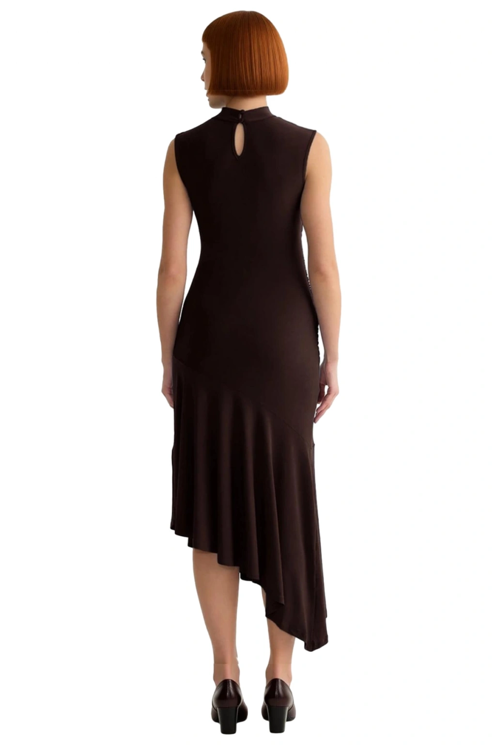 Asil dik yaka tasarımı, boynunuzu zarifçe sararak modern bir şıklık sunar. Kolsuz yapısı, özellikle sıcak havalarda veya kapalı mekan davetlerinde rahatlık sağlarken, stilinize çekici bir hava katar. Sandy dokuya sahip örme kumaş, cildinize yumuşak bir dokunuş sunar ve gün boyu nefes alabilen yapısıyla ferahlık hissi verir. Astarsız tasarımı hafiflik sağlarken, esnek yapısı hareket kabiliyetinizi artırır. Bu elbise, özel günlerde kolayca şıklığı yakalamanız için tasarlanmış olup bakımı da oldukça pratiktir.