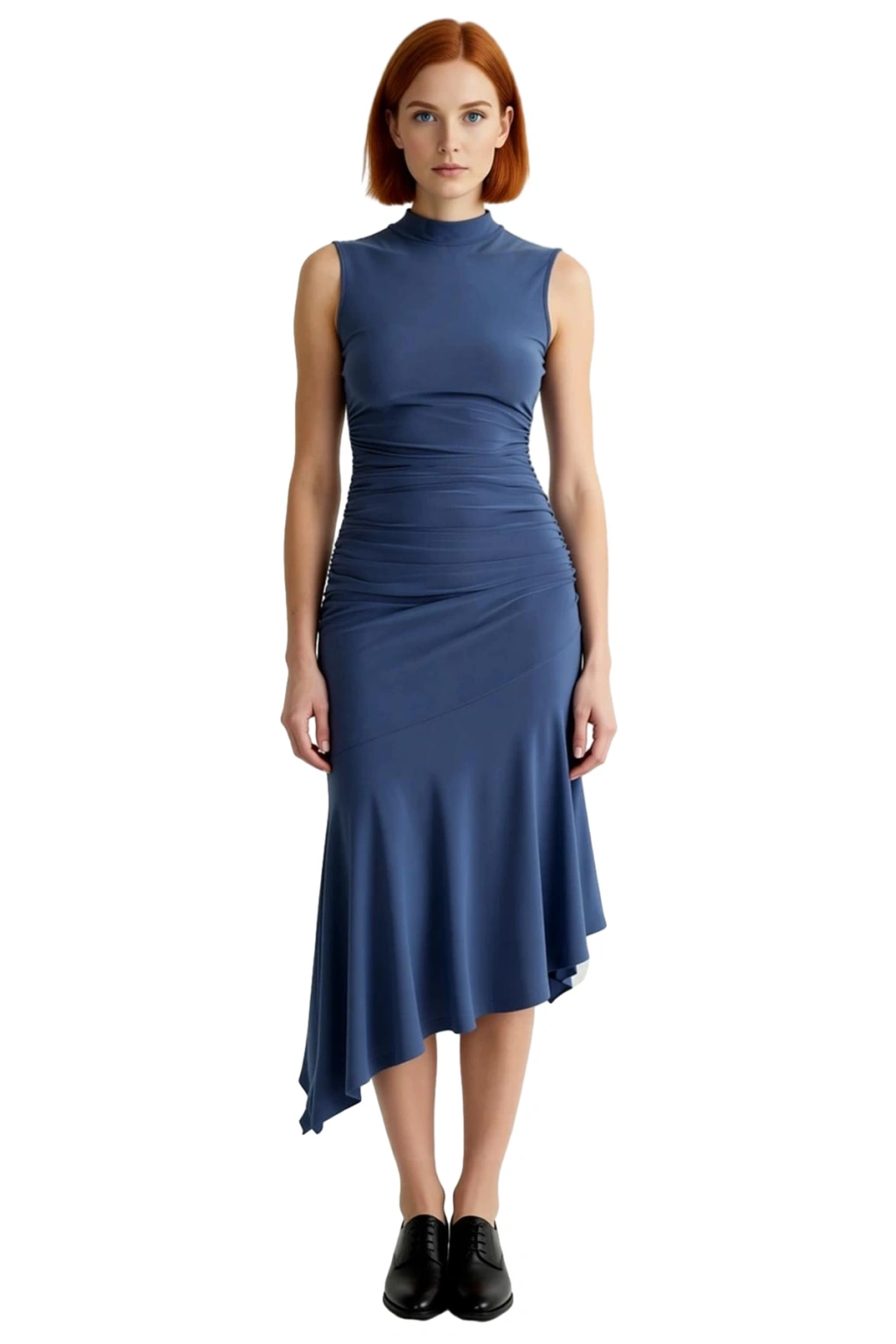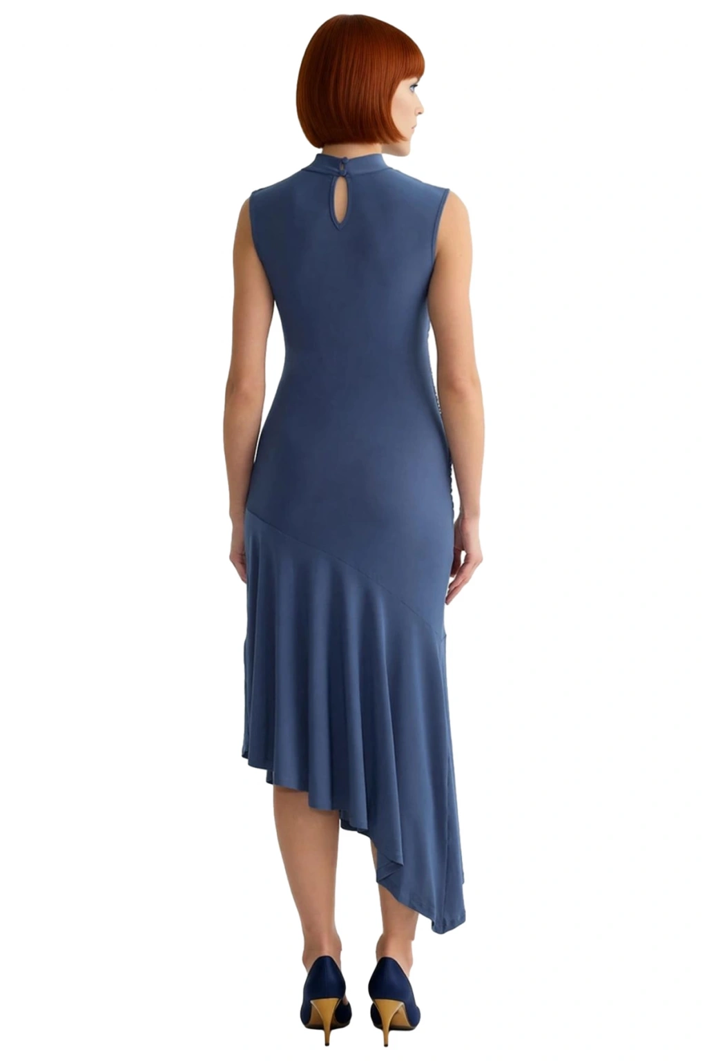 Ürün Özellikleri: Skater kalıp, polyester materyal, düz desen, dik yaka, kolsuz, örme kumaş, mavi renk, volanlı/fırfırlı detay.
