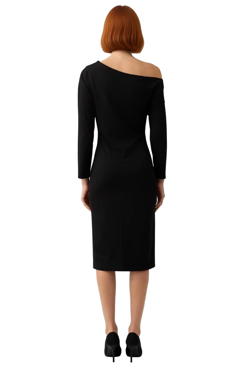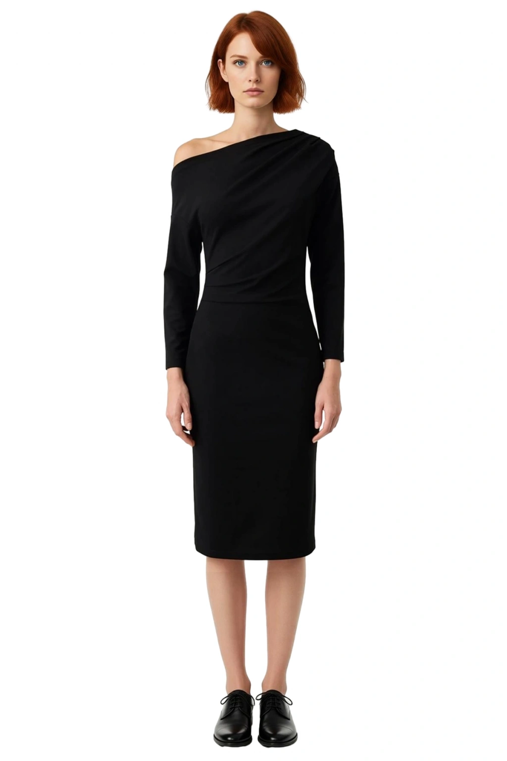 Elbisenin çarpıcı asimetrik kayık yaka tasarımı, omuzları zarifçe açıkta bırakarak dikkat çekici ve modern bir estetik sunar. Reglan kol tipi, uzun kol boyu ile birleşerek gün boyu hareket özgürlüğü sağlarken, şık ve dinamik bir duruş sergiler. Örme kumaş yapısı ve scuba krep dokusu, cildinize yumuşak bir dokunuş vaat ederken, nefes alabilir özelliği sayesinde gün boyu konforlu bir kullanım sunar. Astarsız olmasına rağmen, kaliteli materyal bileşimi sayesinde iç göstermez ve güvenle giyilebilir. Makinede yıkanabilir özelliği (T10 talimatına uygun), bakımını oldukça pratikleştirirken, dayanıklı yapısı bu elbiseyi gardırobunuzun uzun yıllar favori parçası olmasını sağlar. Bu detaylar sayesinde hem stil sahibi hem de rahatlık odaklı bir deneyim yaşatır.