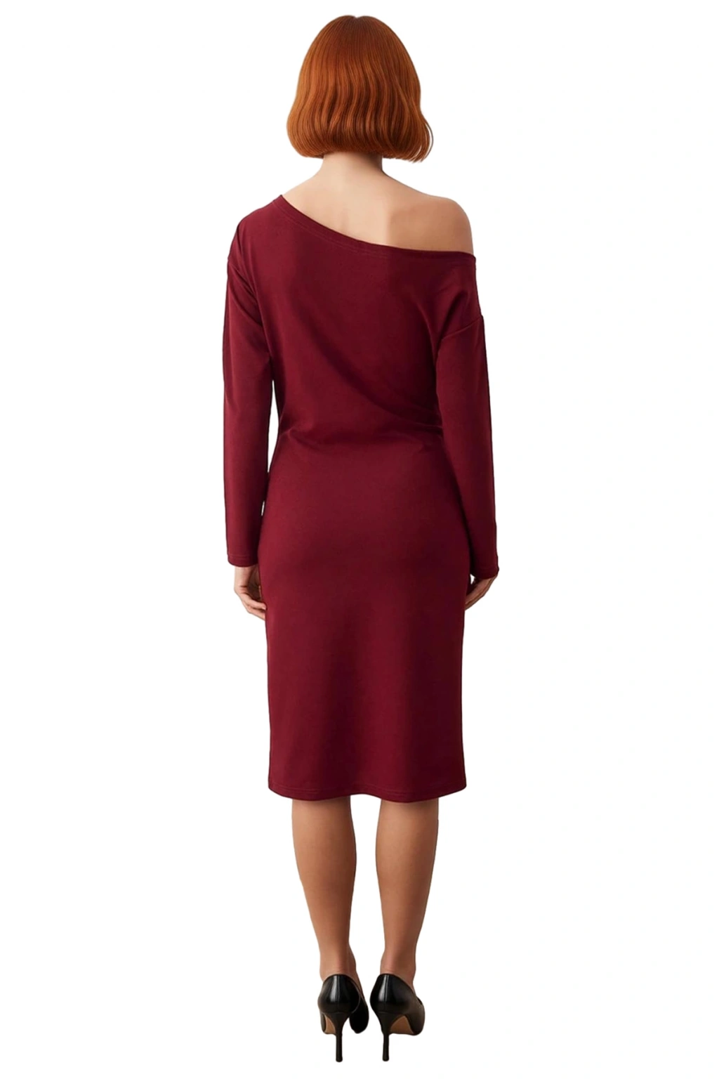 Ürün Özellikleri: Bodycon kalıp, %98 polyester %2 elastan materyal, düz desen, asimetrik kayık yaka, reglan kol, scuba krep örme kumaş, bordo renk.