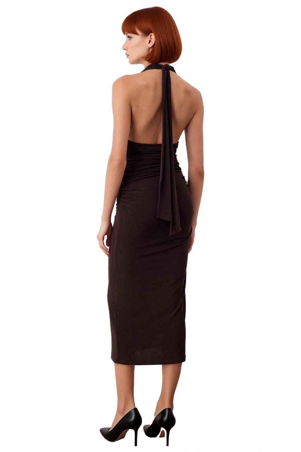 Ürün Özellikleri: Bodycon kalıp, polyester elastan materyal, düz desen, boyundan bağlamalı yaka, kolsuz kol, örme sandy kumaş, kahverengi renk, aksesuar detaylı tasarım.
