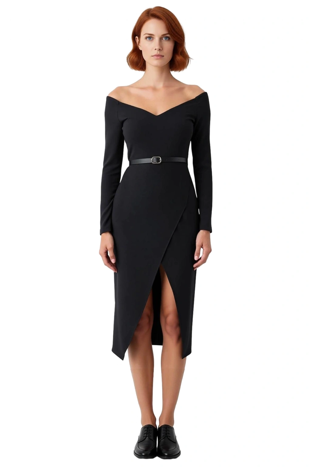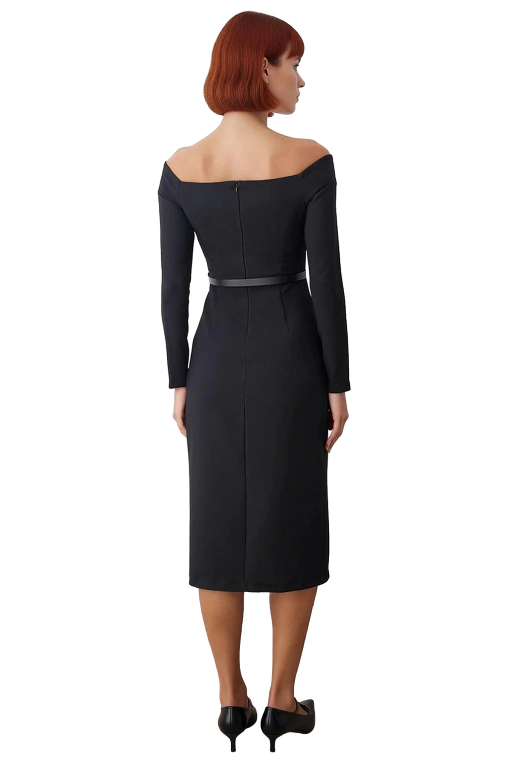 Ürün Özellikleri: Bodycon kalıp, %88 polyester %12 elastan materyal, düz desen, carmen yaka, standart kol, dokuma kumaş, siyah renk.