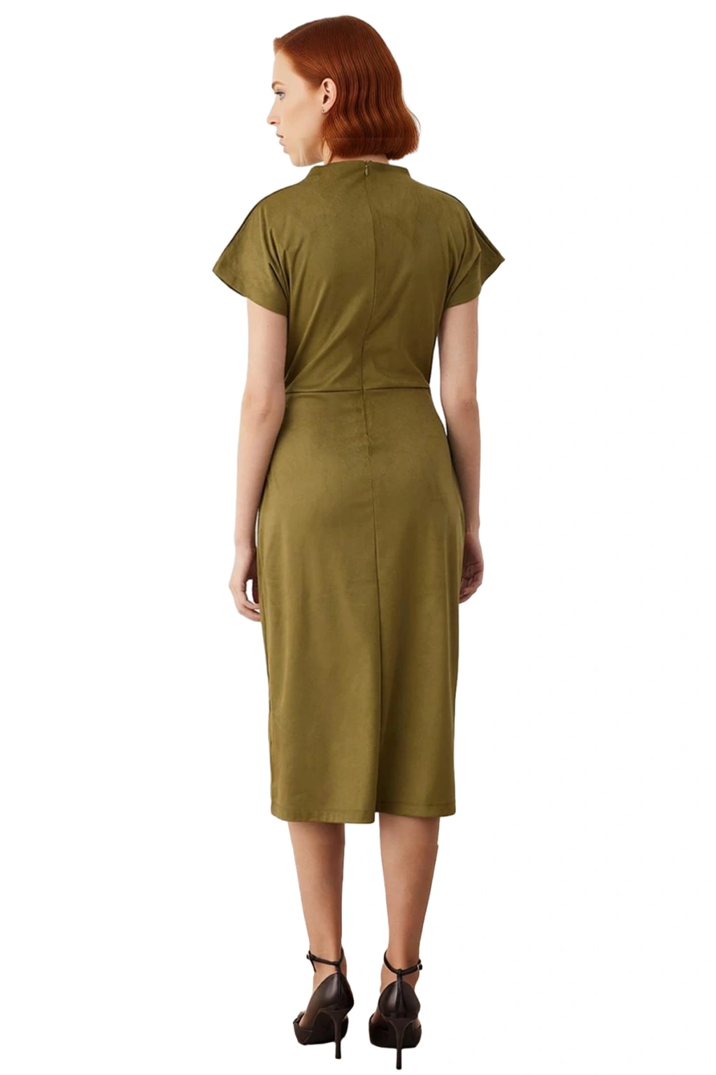 Ürün Özellikleri: Dik yaka, düz desen, süet örme kumaş, bodycon kalıp, düşük kol, kısa kol, midi boy, astarsız, büzgülü detay, haki renk, %98 polyester, %2 elastan, kış sezonu, casual kullanım.