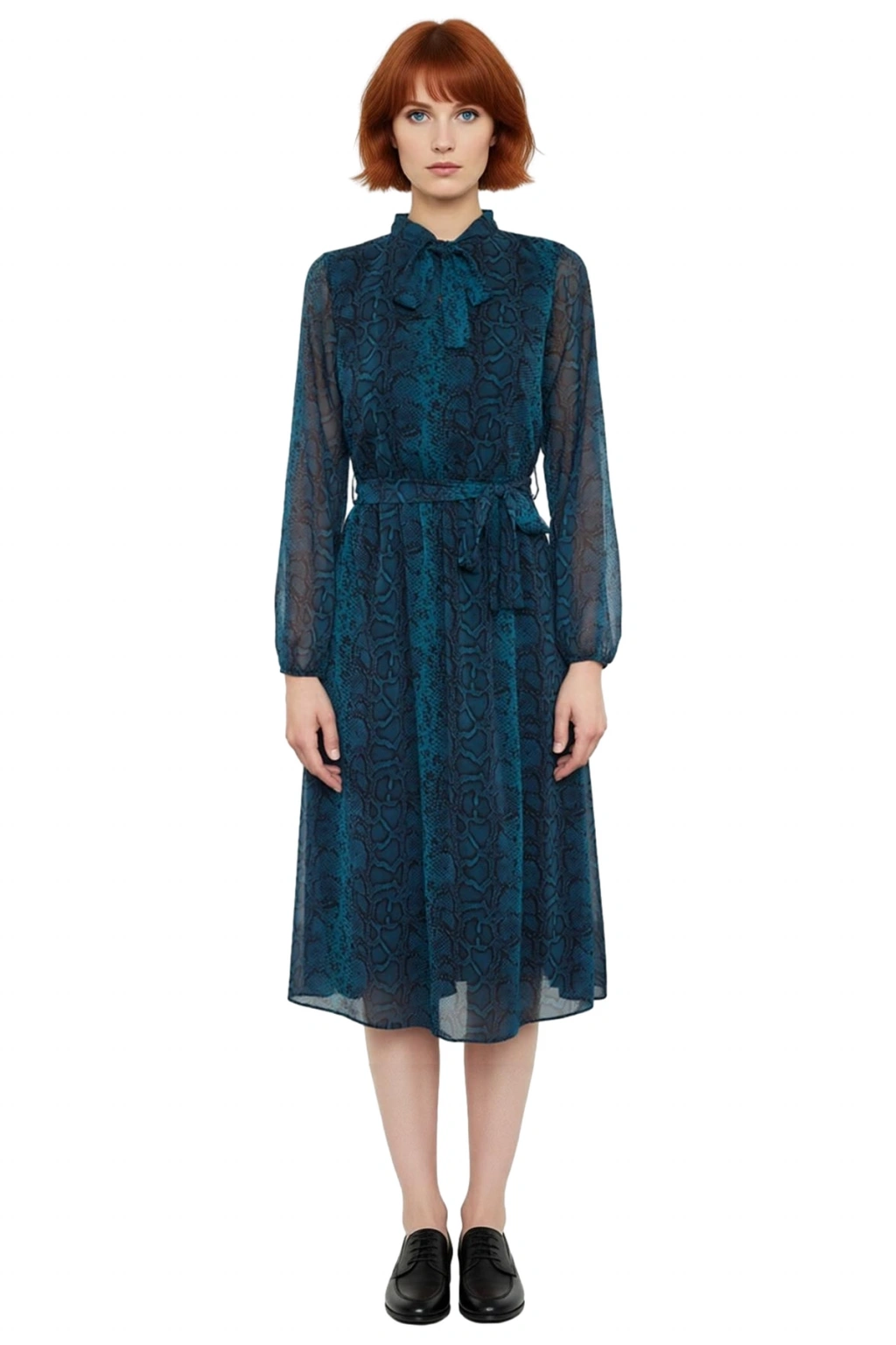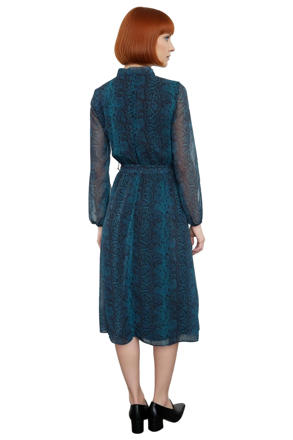 Ürün Özellikleri: A kesim kalıp, dokuma materyal, hayvan deseni, fular yaka, balon kol, şifon kumaş, yeşil renk, kuşaklı tasarım.