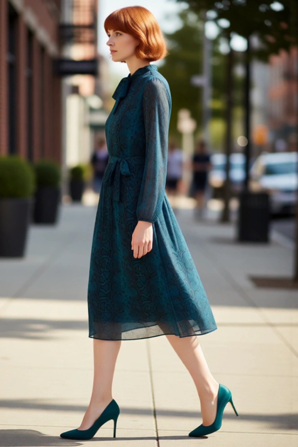 Bu kadın elbisesi, feminen A kesim silueti ve uçuş uçuş dokuma şifon materyali ile zarafeti ve rahatlığı bir araya getiriyor. Astarlı yapısı sayesinde iç göstermeden güvenli bir kullanım sunarken, yeşil tonlarındaki çarpıcı hayvan deseni ile stilinize modern bir dokunuş katıyor. Fular yaka detayı, klasik ve şık bir görünüm sağlarken, bu elbiseyi ilkbahar ve sonbahar günlerinin en özel parçası haline getirir.