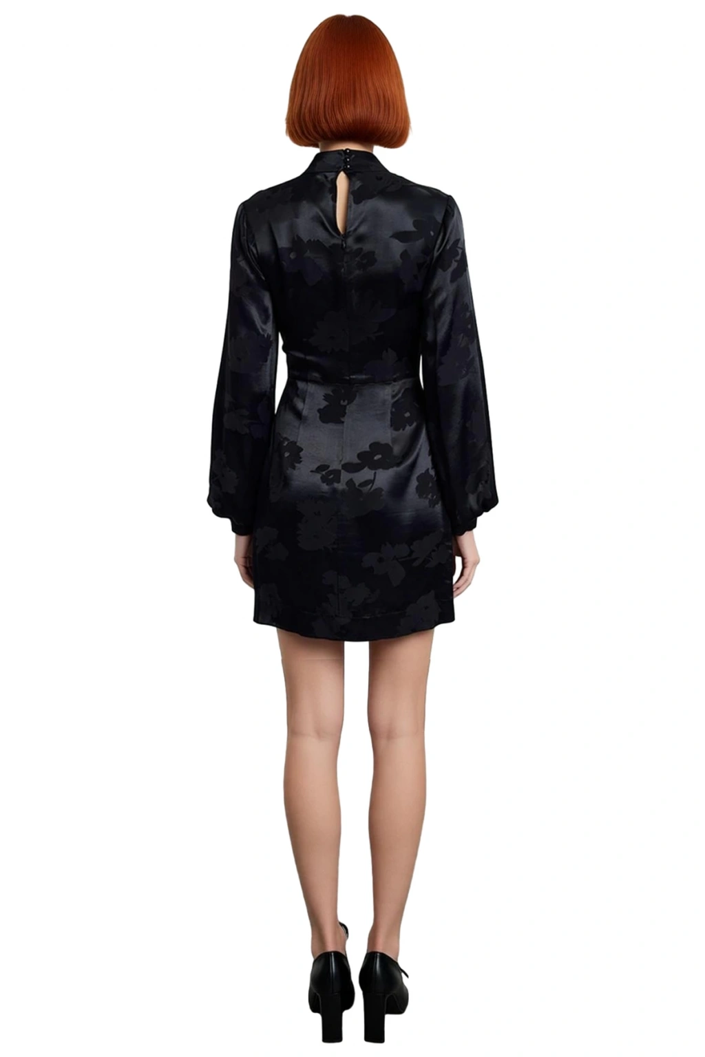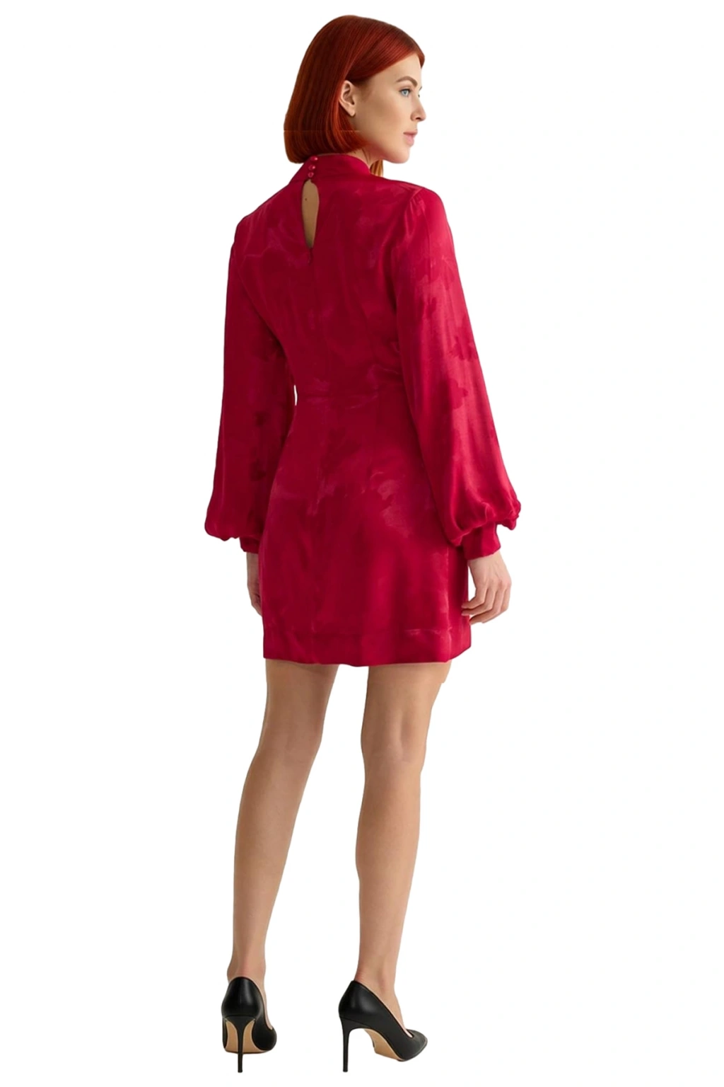 Ürün Özellikleri: A-line kalıp, dokuma materyal, jakar desen, dik yaka, balon kol, dokuma kumaş, bordo renk, baskısız tasarım.