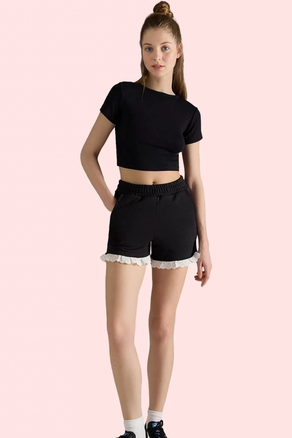 Kısa boyu ve boru paçası ile modern ve şık bir tarz yakalamanızı sağlayan bu şort, renk bloklu tasarımı ve dantel detayıyla stilinizi tamamlayacak. Dokuma detayları, şorta benzersiz bir hava katarken, kaliteli kumaşı sayesinde uzun yıllar boyunca kullanabilirsiniz. Beli lastikli yapısı ise mükemmel bir uyum sağlayarak gün boyu rahat etmenizi sağlar. Makinede kolayca yıkanabilme özelliği ise pratik kullanım sunar.