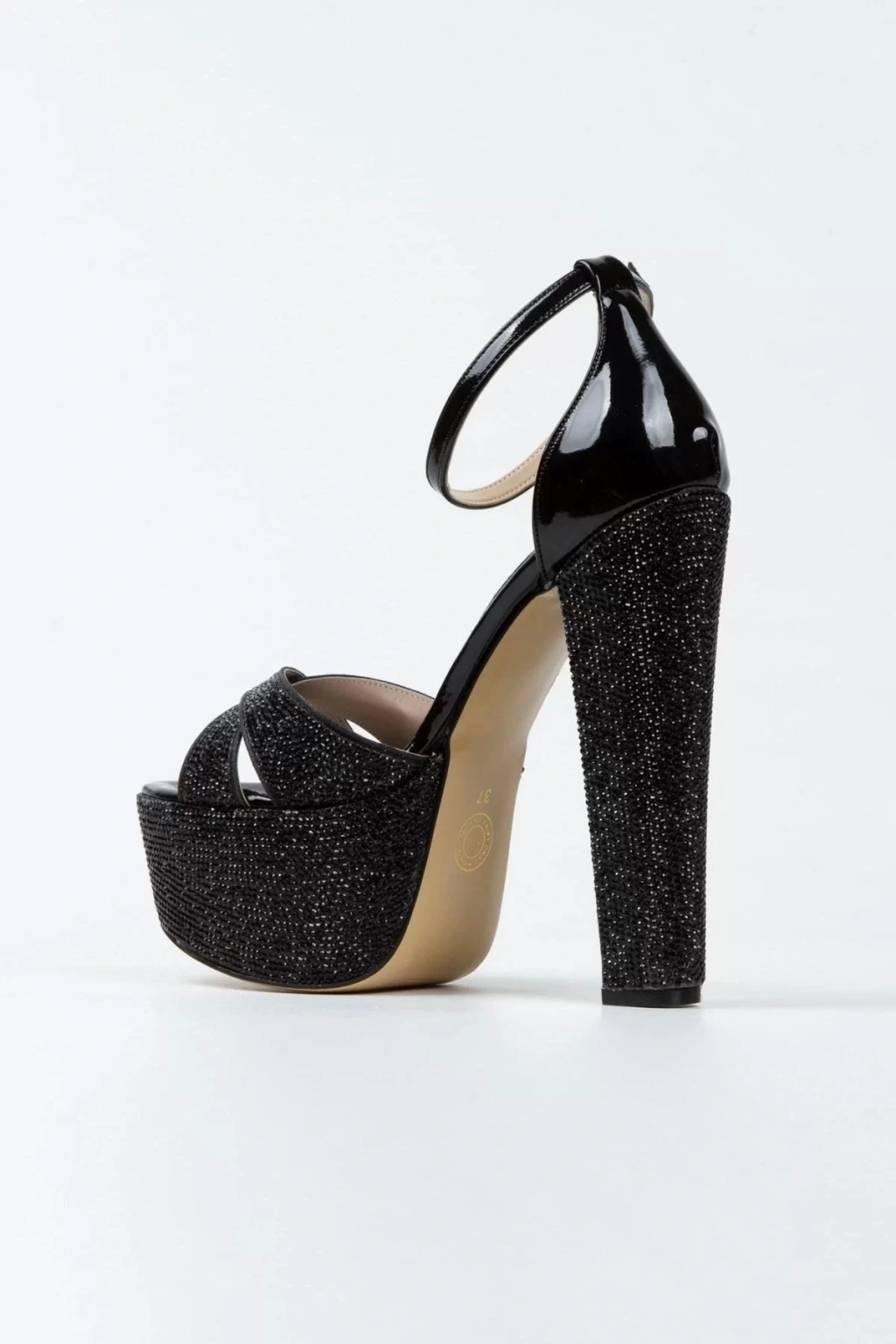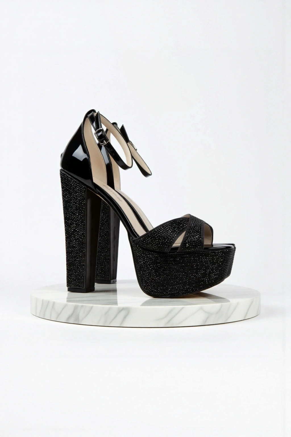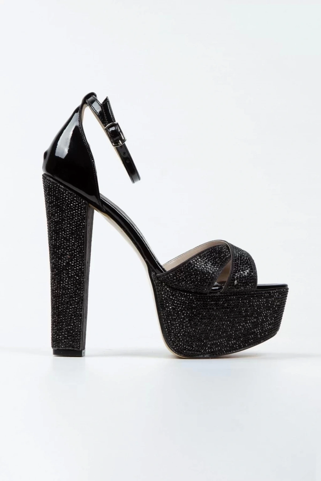 Şık ve gece ortamları için ideal, göz alıcı bir tasarıma sahip siyah rugan taşlı çapraz model klasik topuklu platformlu kadın abiye ayakkabı.