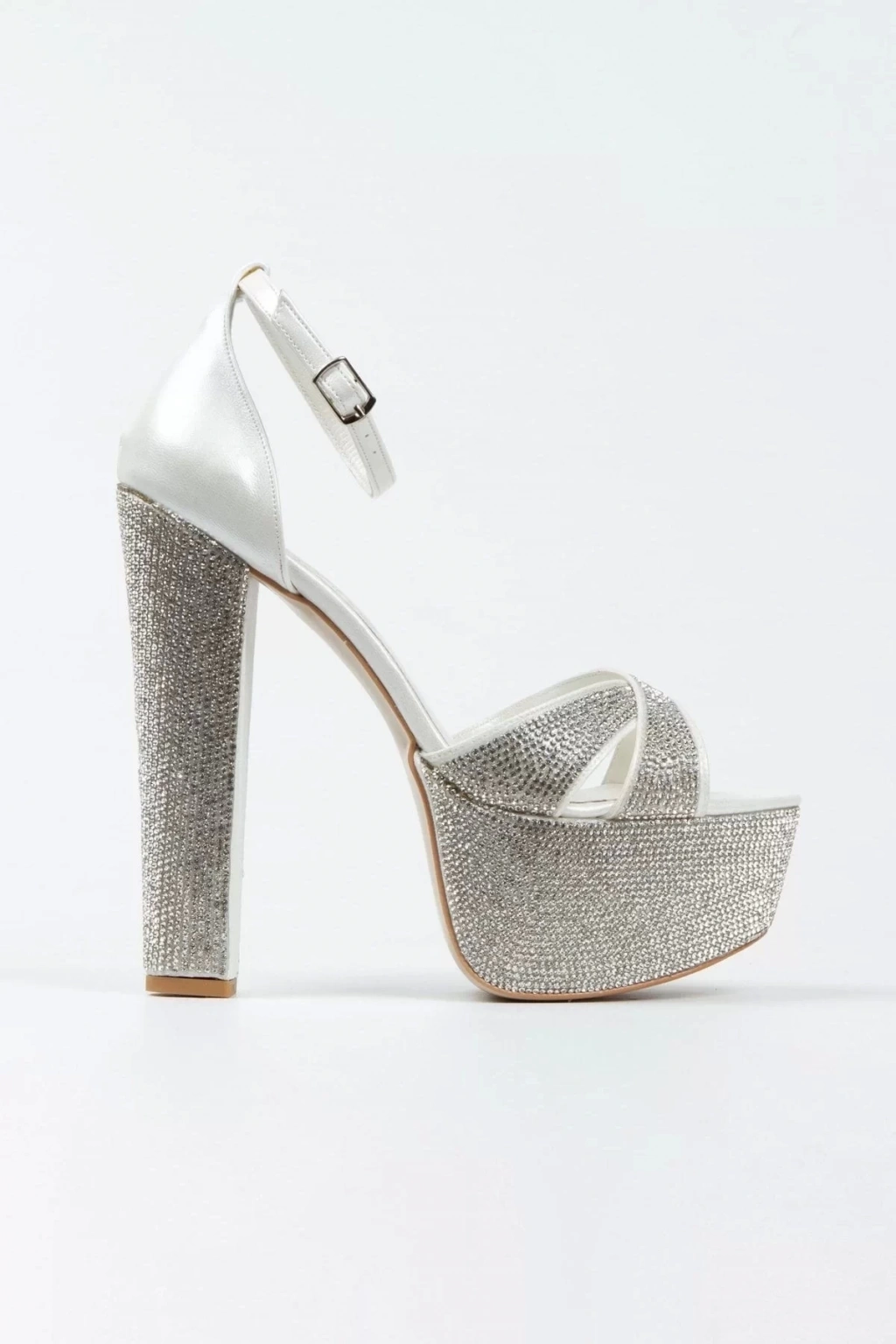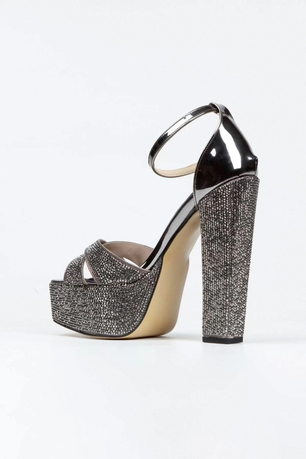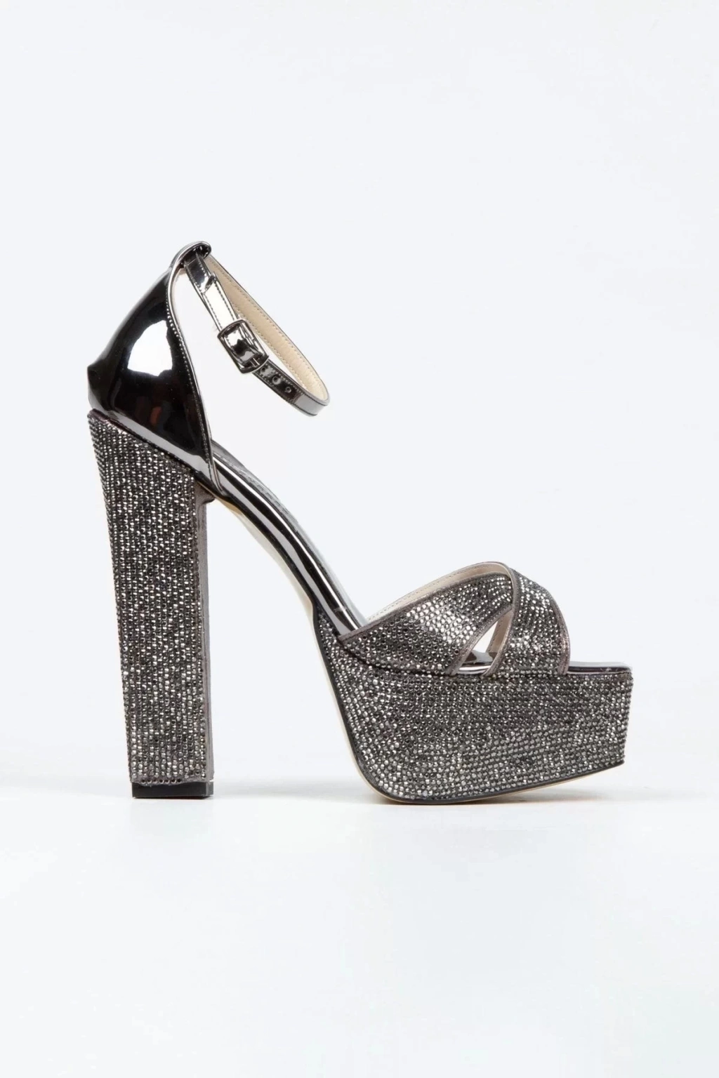 Şık ve gece ortamları için ideal, göz alıcı bir tasarıma sahip siyah rugan taşlı çapraz model klasik topuklu platformlu kadın abiye ayakkabı.