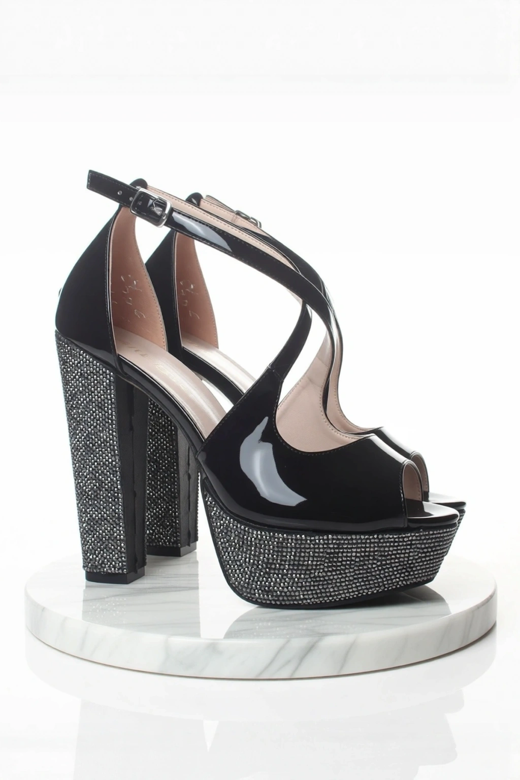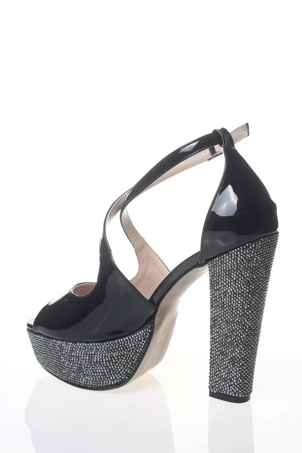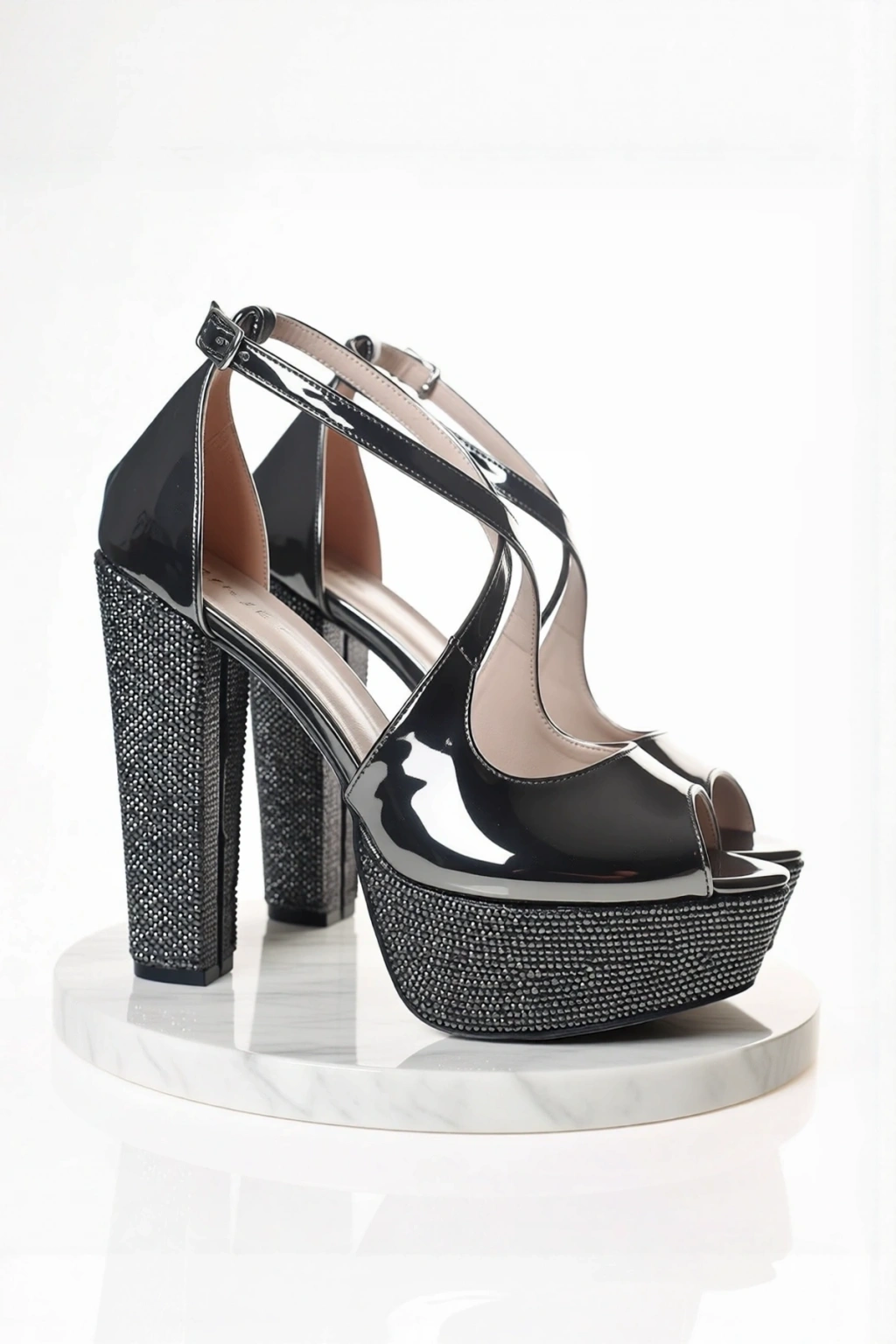 Şık ve gece ortamları için ideal, siyah rugan ökçe poli taş detaylarıyla göz alıcı bir görünüm sunar.