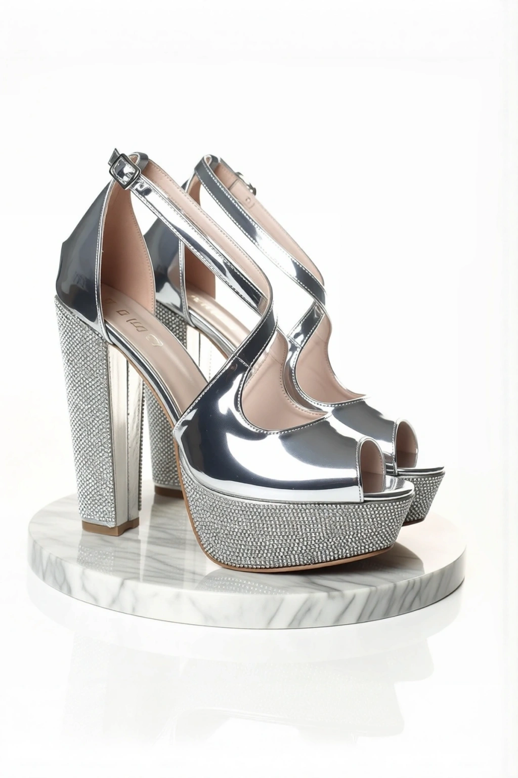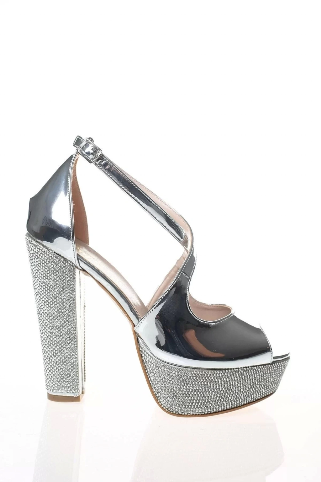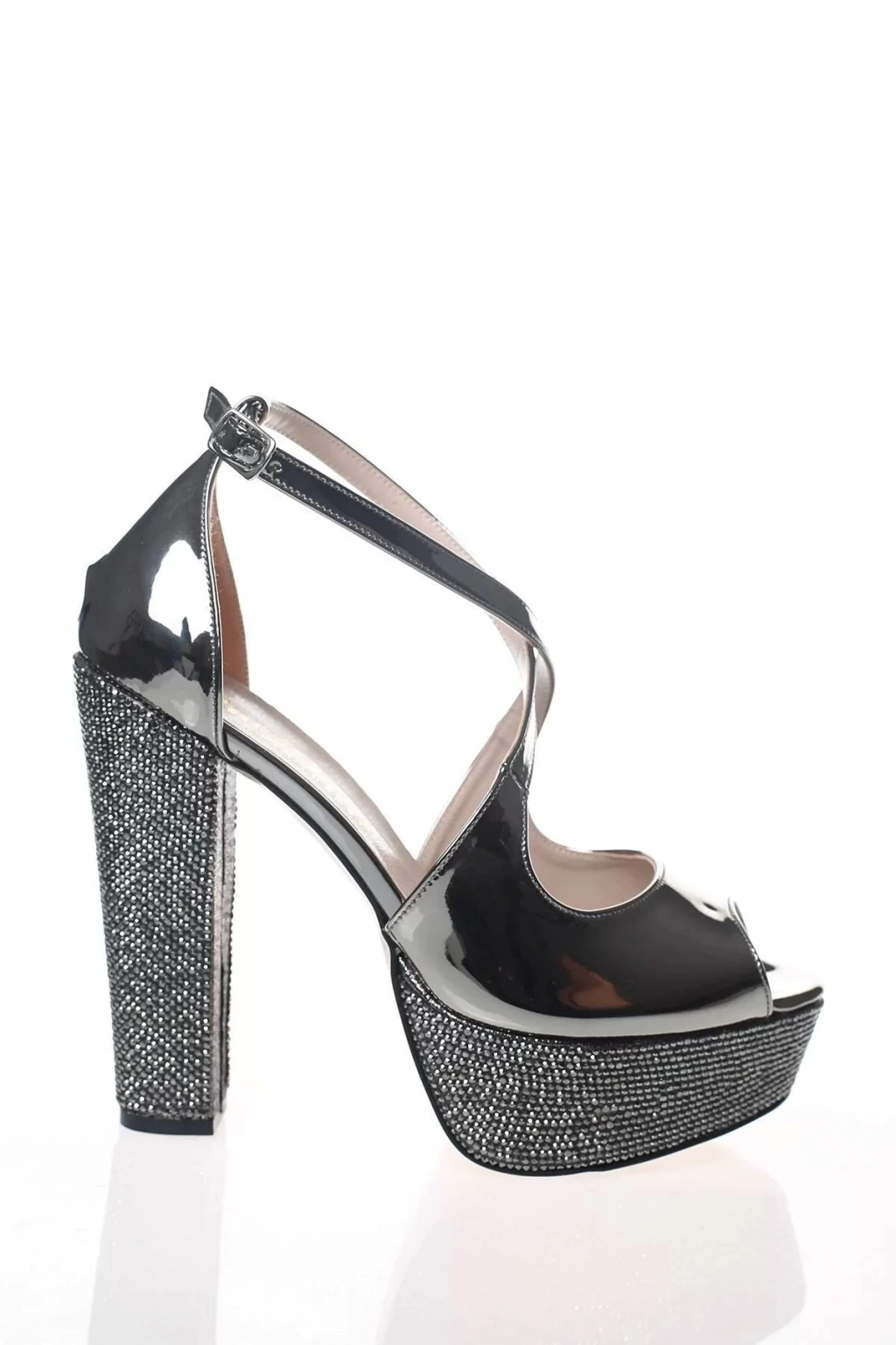 Şık ve gece ortamları için ideal, siyah rugan ökçe poli taş detaylarıyla göz alıcı bir görünüm sunar.
