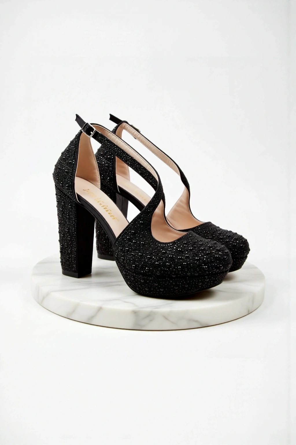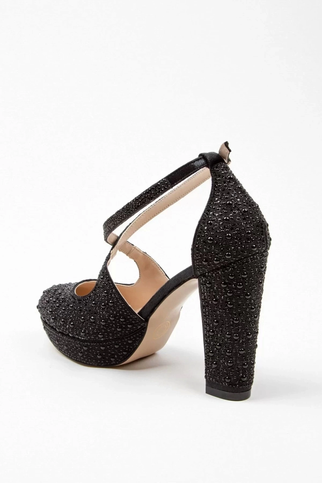 Zarif tasarımıyla dikkat çeken siyah full inci taş topuklu kadın abiye ayakkabı, özel günlerinizde şıklığınızı tamamlar.