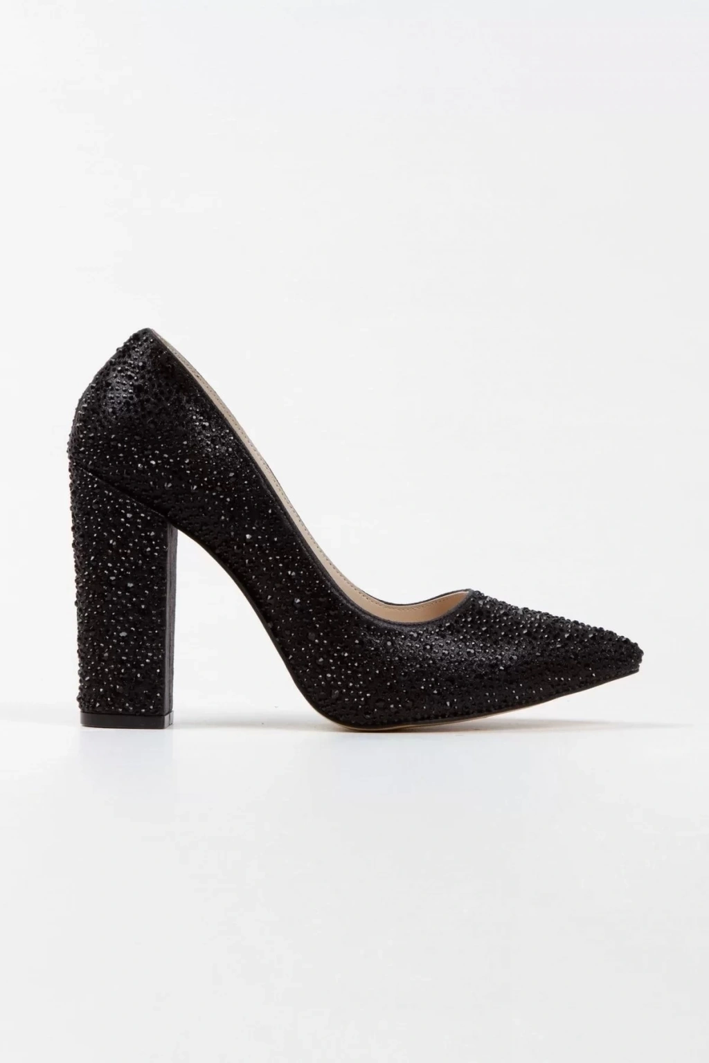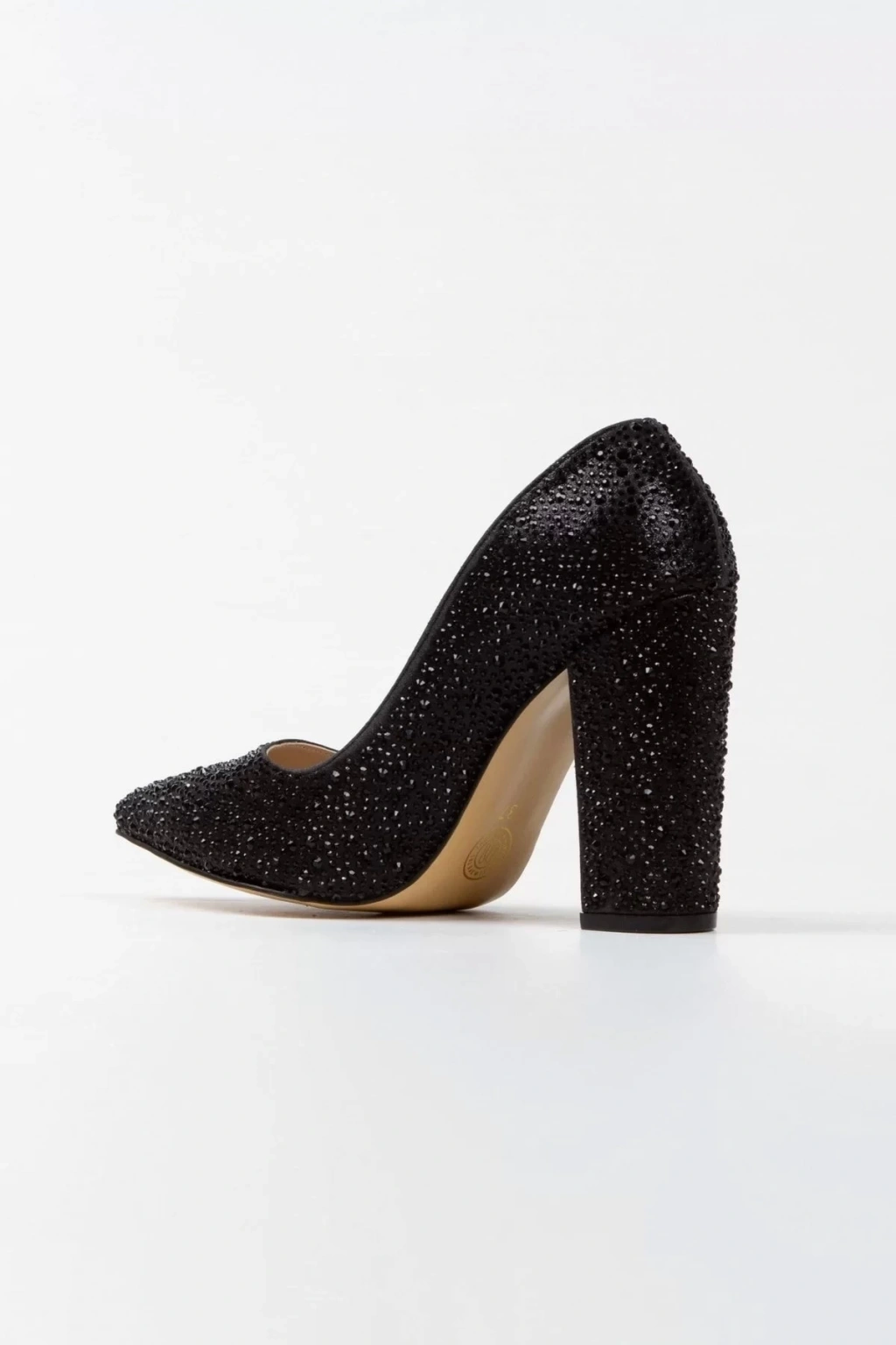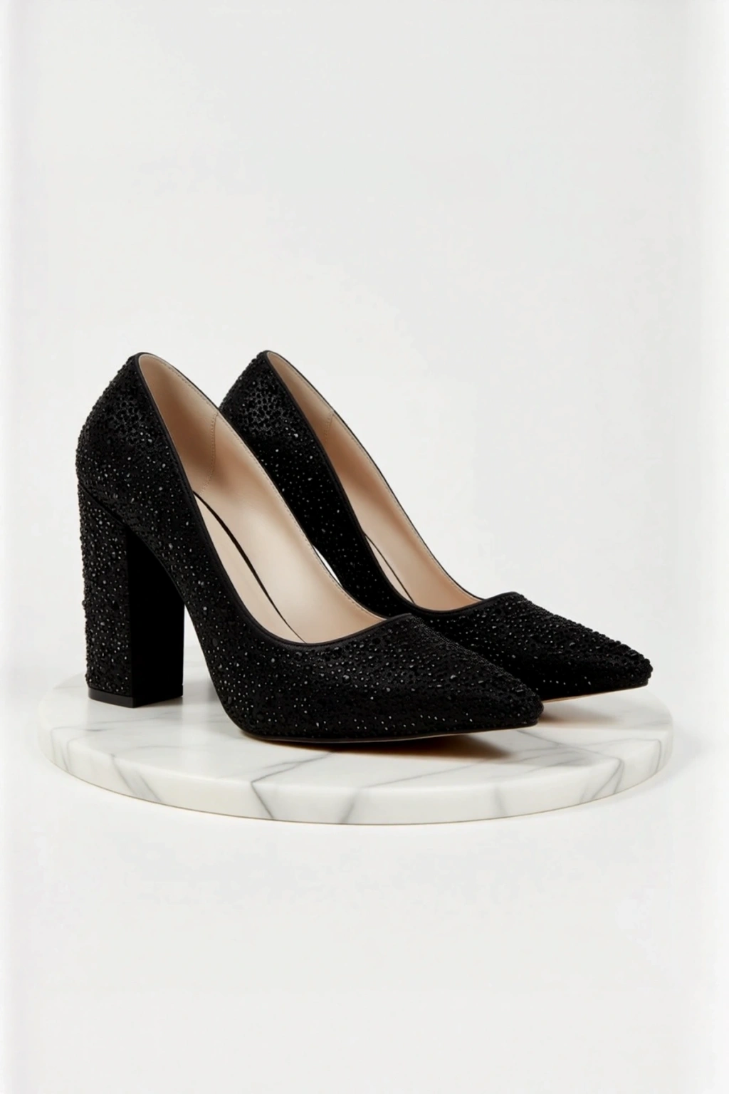 Zarif tasarımıyla dikkat çeken siyah sultan taşlı klasik sivri kalın topuklu kadın abiye ayakkabı, özel günlerinizde şıklığınızı tamamlar.