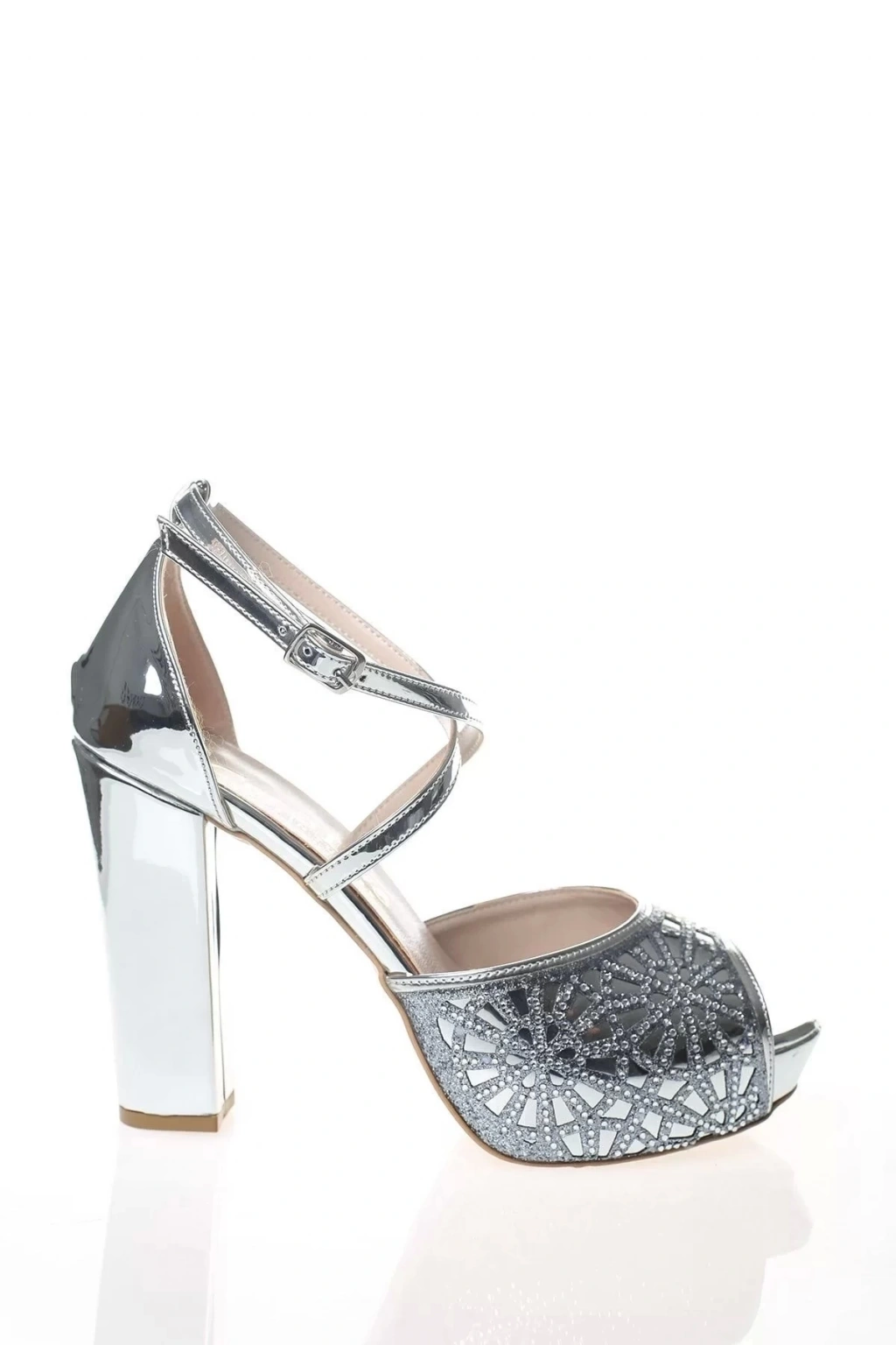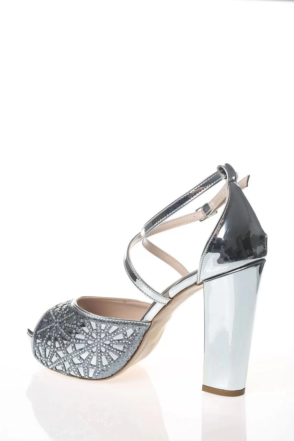 Zarif tasarımıyla dikkat çeken bu gümüş ayna kristal yüz lazer abiye ayakkabı, yüksek topuklu (10 cm ve üzeri) yapısıyla şıklığınızı tamamlar.