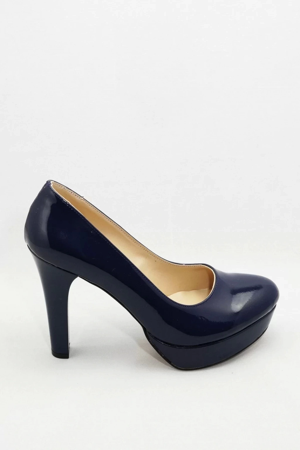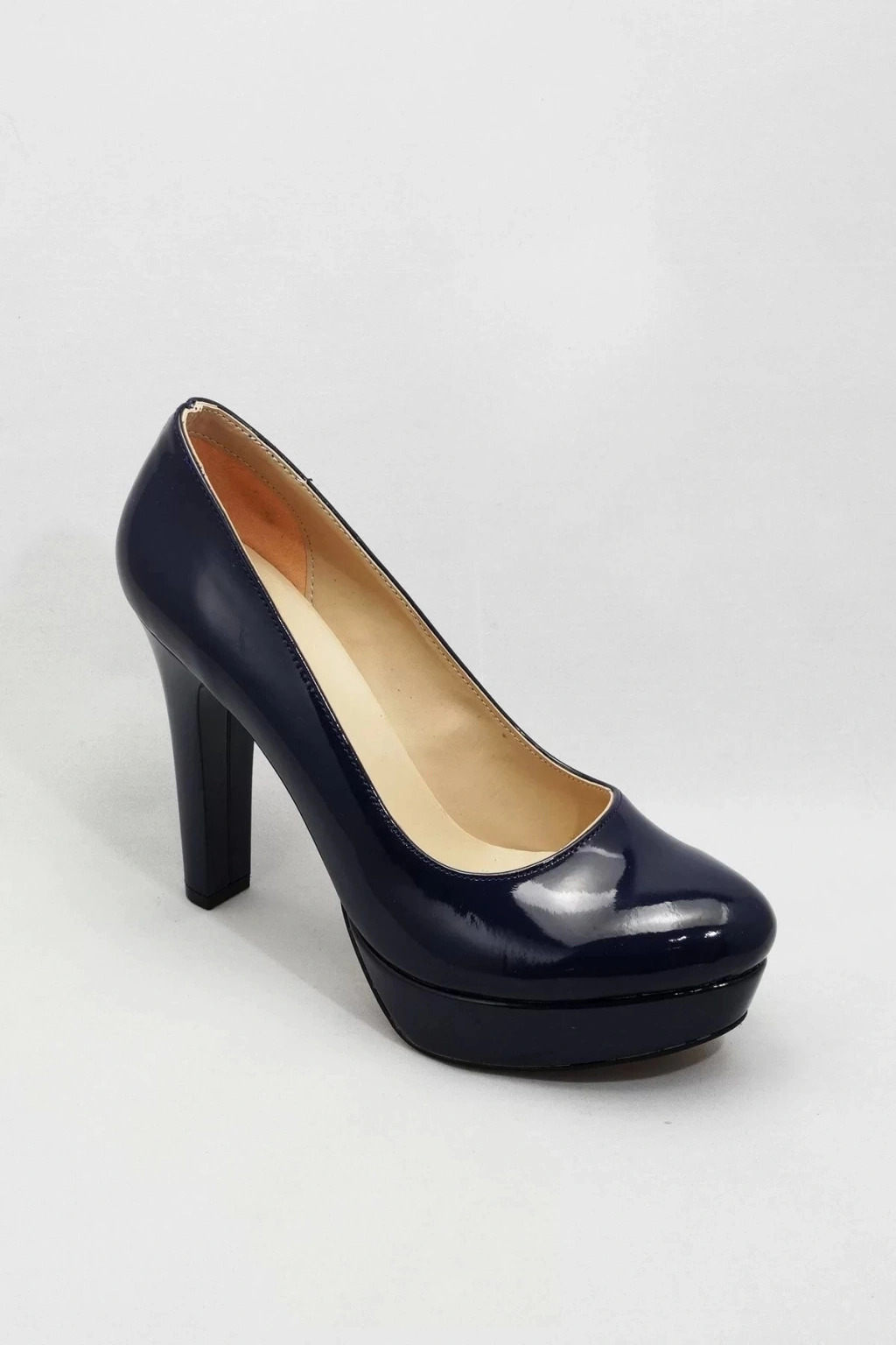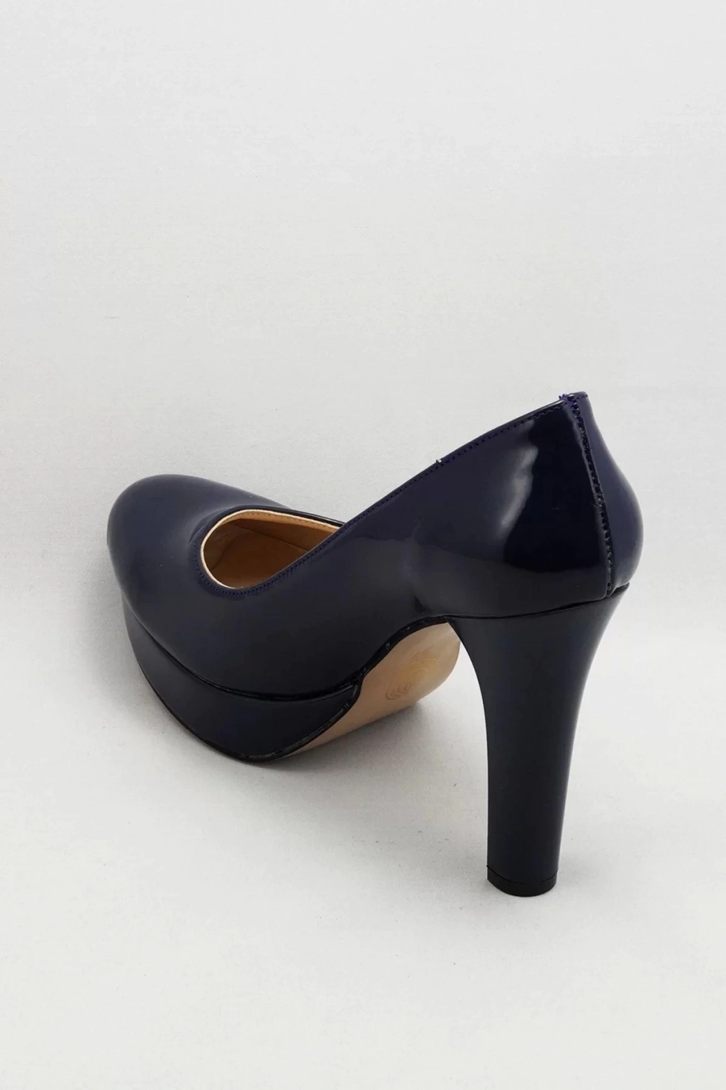 Klasik ve şık tasarımıyla her kıyafetle uyum sağlayan lacivert renkli topuklu ayakkabı, düz deseniyle sade ve zarif bir görünüm sunar.