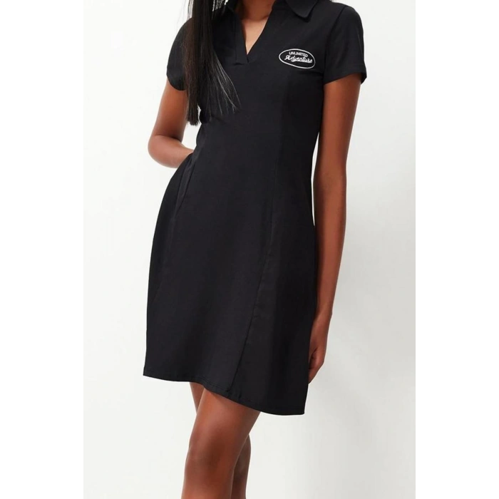 Kadın Moda Şık Mini Boy Polo Yaka Regular Skater Belden Açılan Nakışlı Pamuklu Esnek Örme Elbise