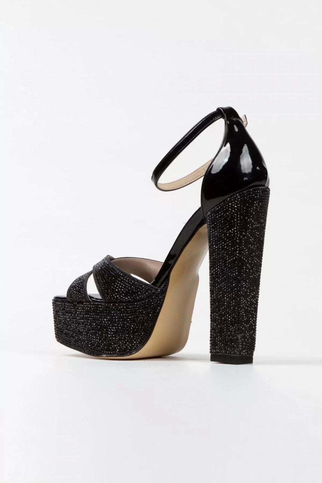 Zarif tasarımıyla dikkat çeken siyah rugan full taş detaylı kalın topuklu ayakkabı, şıklığınızı tamamlar.