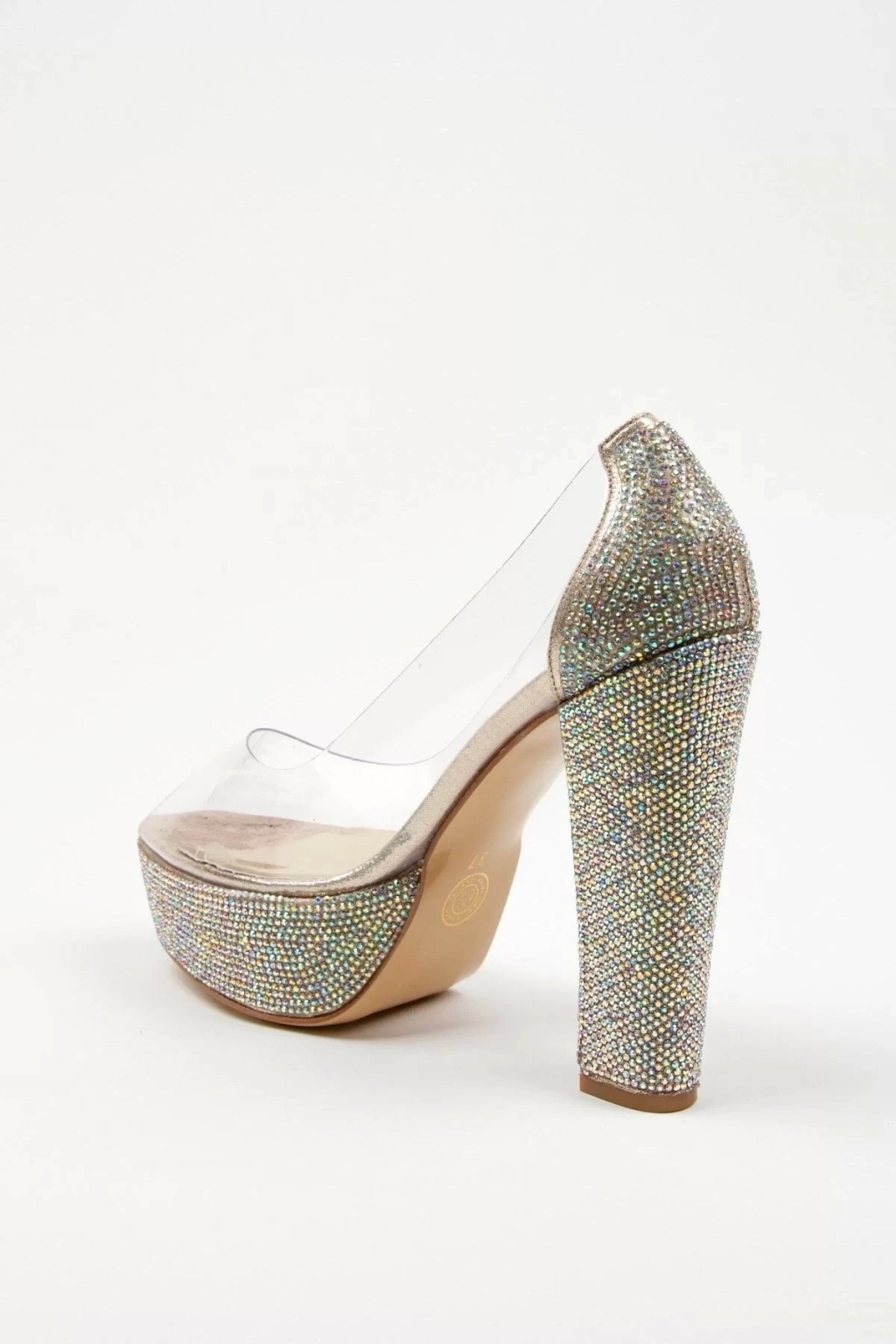 Zarif tasarımıyla dikkat çeken yüksek topuklu (10 cm ve üzeri) Rose şeffaf platformlu ökçe poli taş topuklu kadın abiye ayakkabı, şıklığınızı tamamlar.