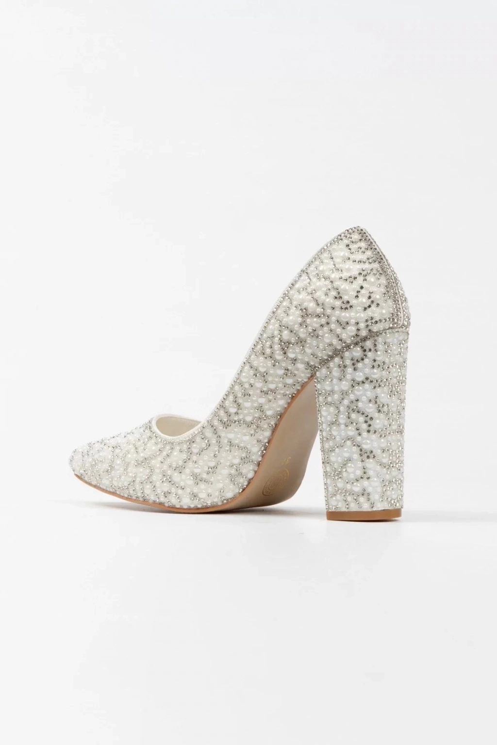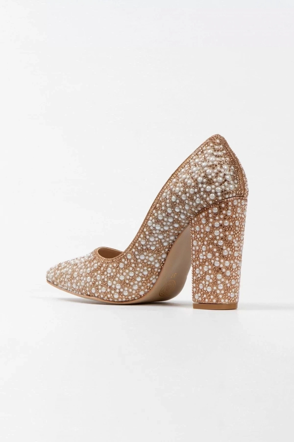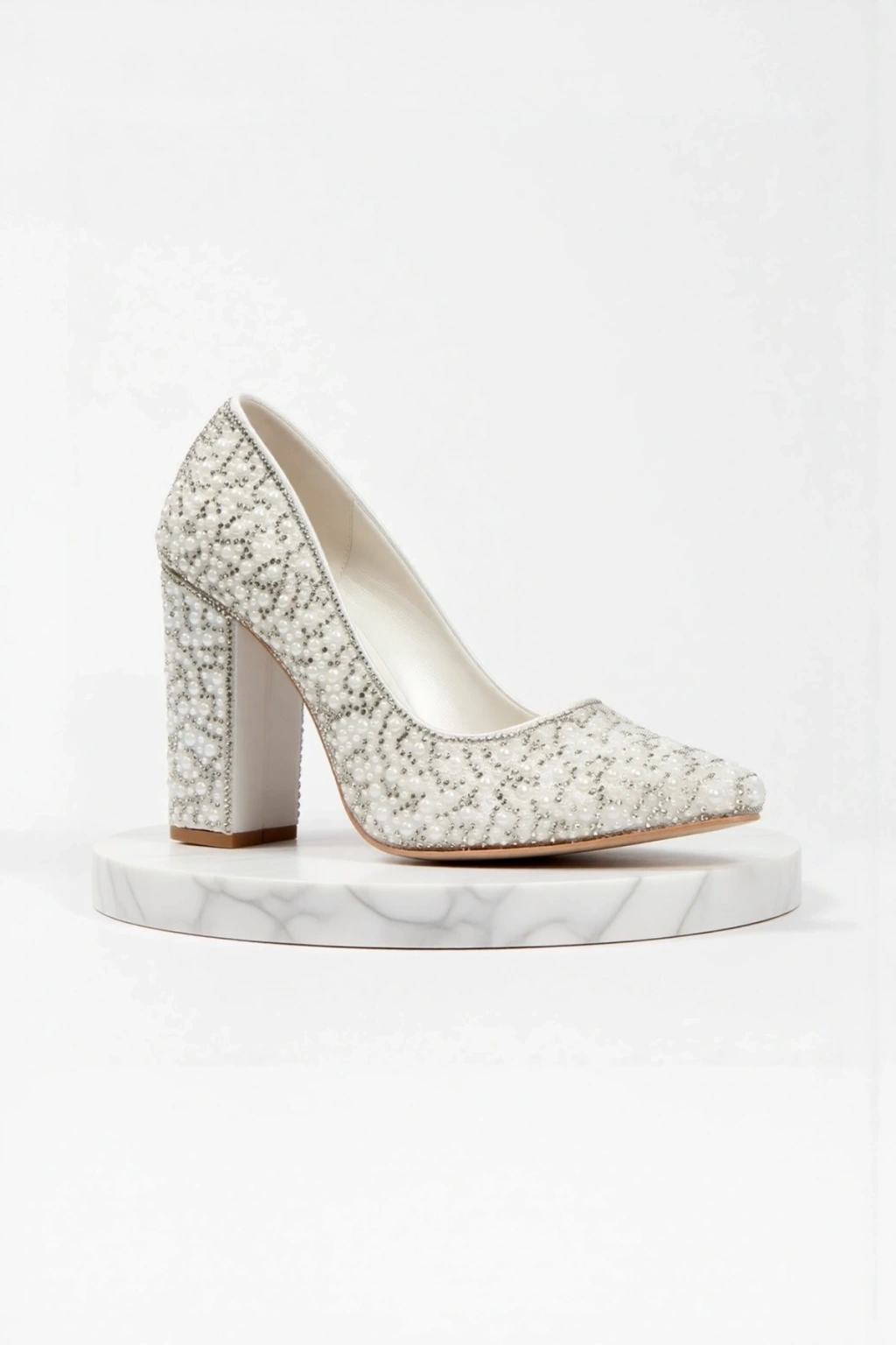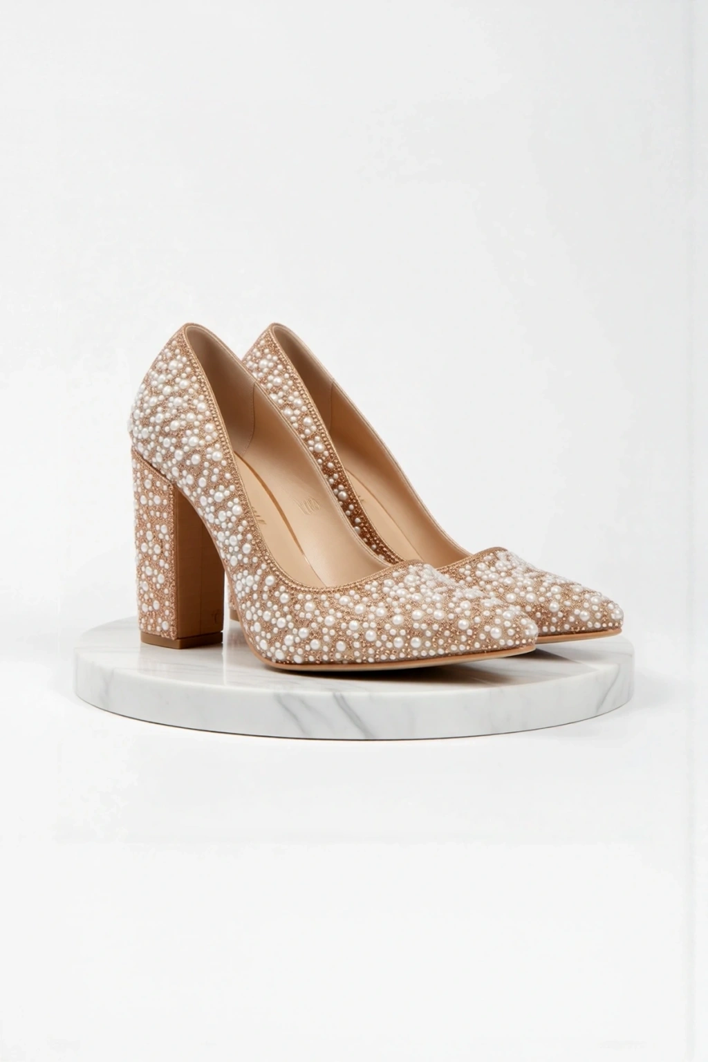 Zarif tasarımıyla dikkat çeken sedef sultan inci taşlı klasik sivri kalın topuklu kadın abiye ayakkabı, şıklığınızı tamamlayacak bir aksesuardır.