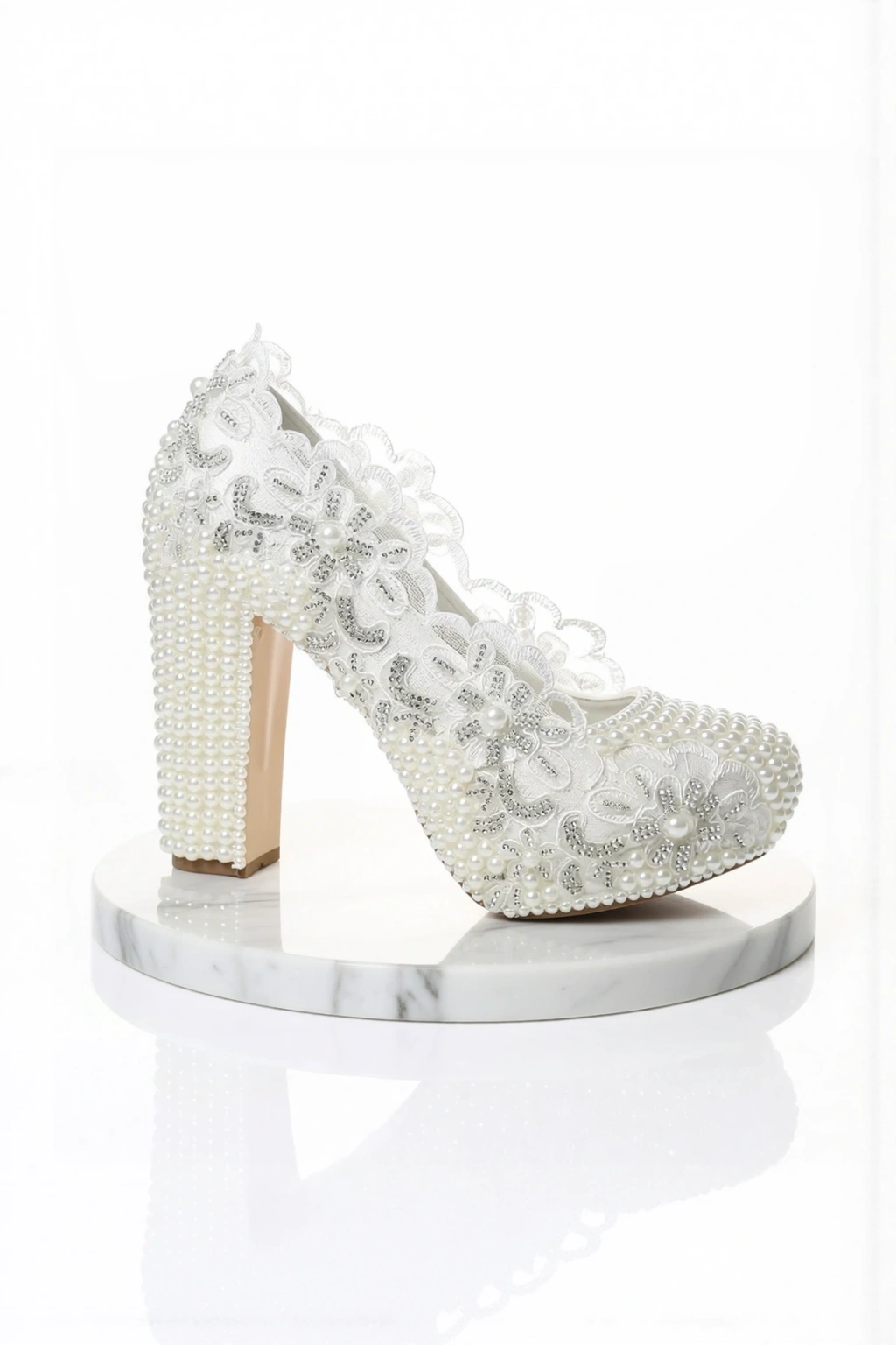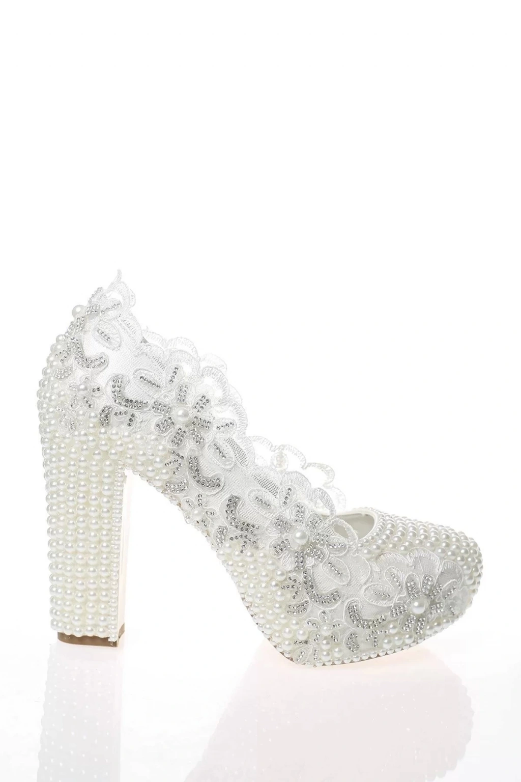 Zarif tasarımıyla dikkat çeken sedef inci taş işlemeli gelin ayakkabı, özel günlerinizde şıklığınızı tamamlar.