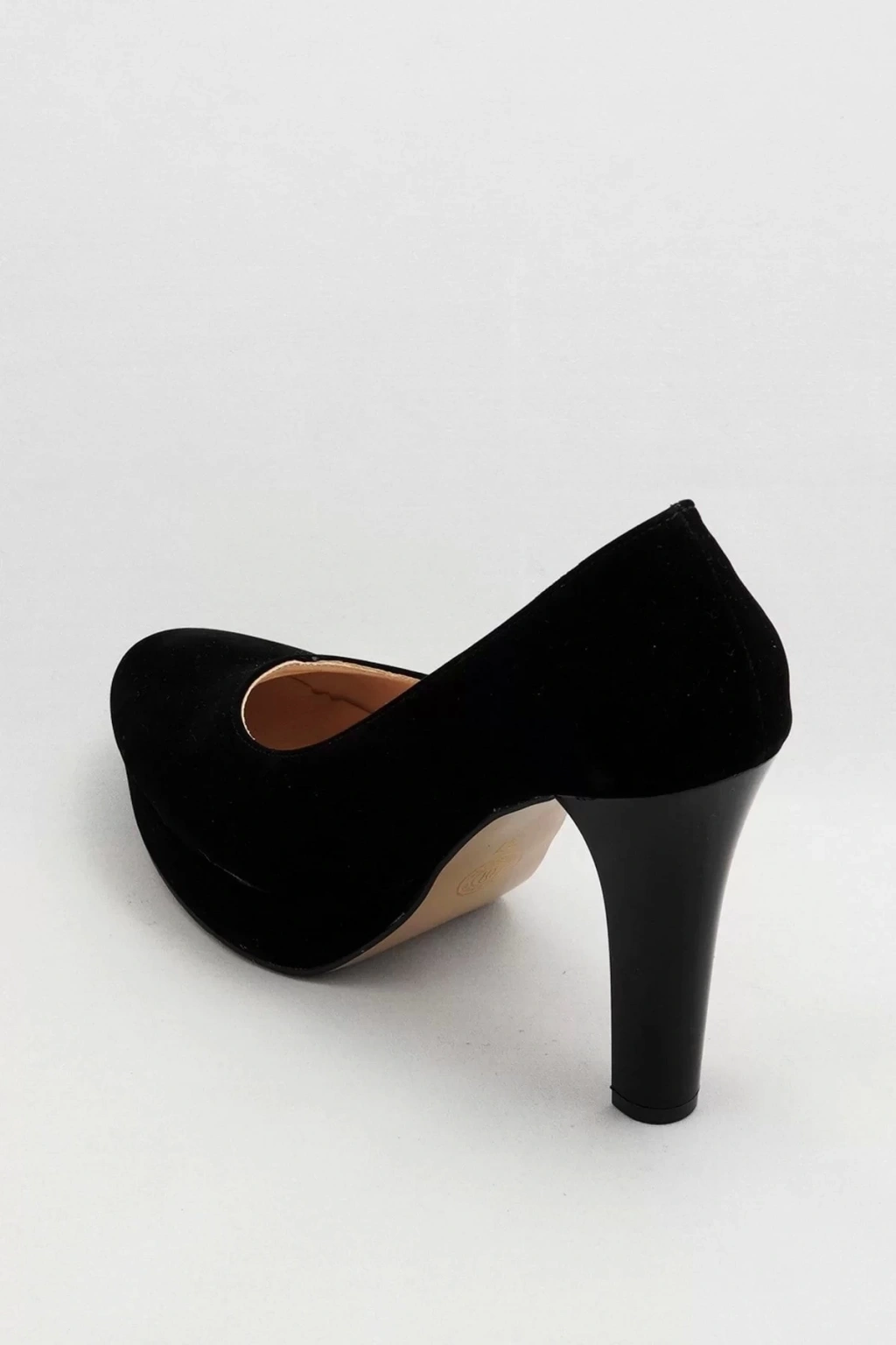 Süet materyali ile zarif bir dokunuş sunan siyah klasik topuklu ayakkabı, şıklığınızı tamamlar.