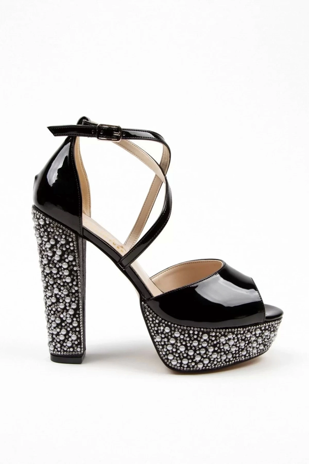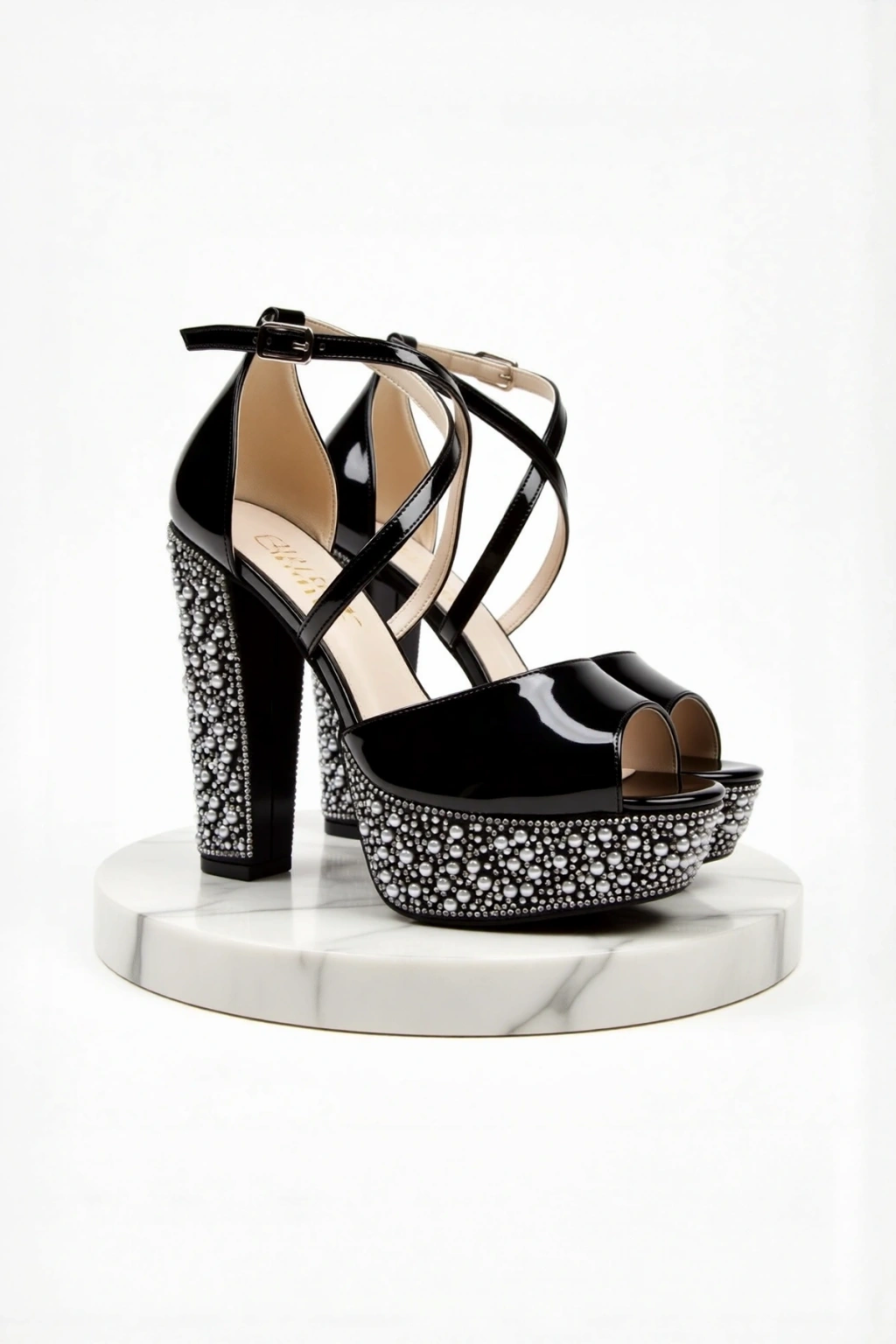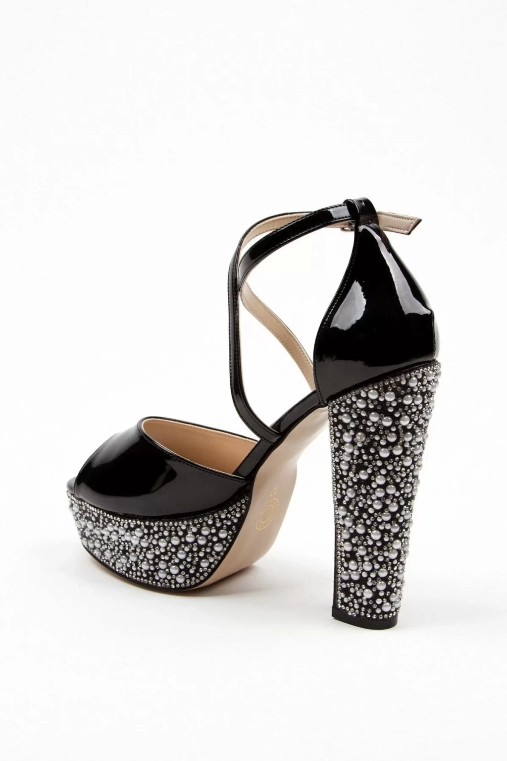 Zarif tasarımıyla dikkat çeken siyah rugan ökçe poli inci topuklu kadın abiye ayakkabı, kalın topuklu yapısı sayesinde hem şıklığı hem de rahatlığı bir arada sunar.