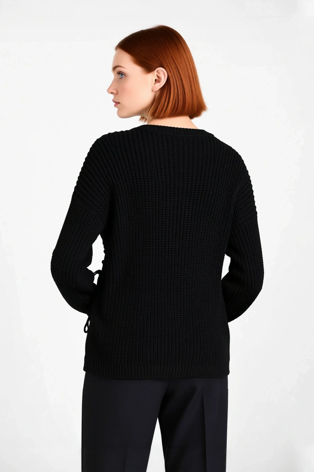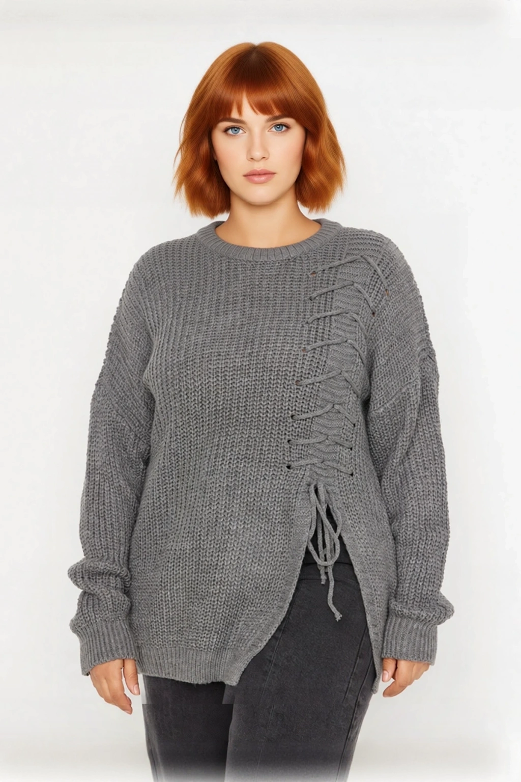 Ürün Özellikleri: Relaxed kalıp, akrilik materyal, düz desen, bisiklet yaka, düşük kol, triko kumaş, antrasit renk, baskısız tasarım, bağcıklı detay.
