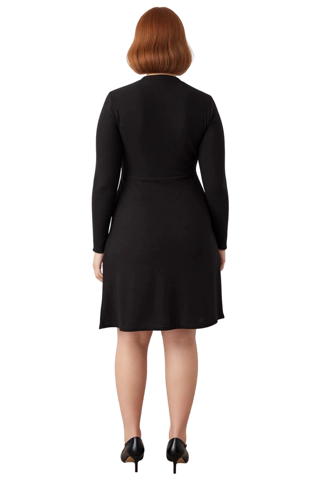 Ürün Özellikleri: A-line kalıp, %100 Polyester materyal, düz desen, bisiklet yaka, standart uzun kol, örme kaşkorse kumaş, siyah renk.