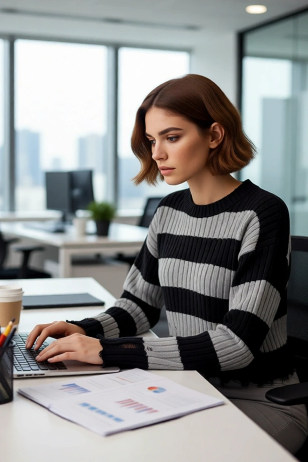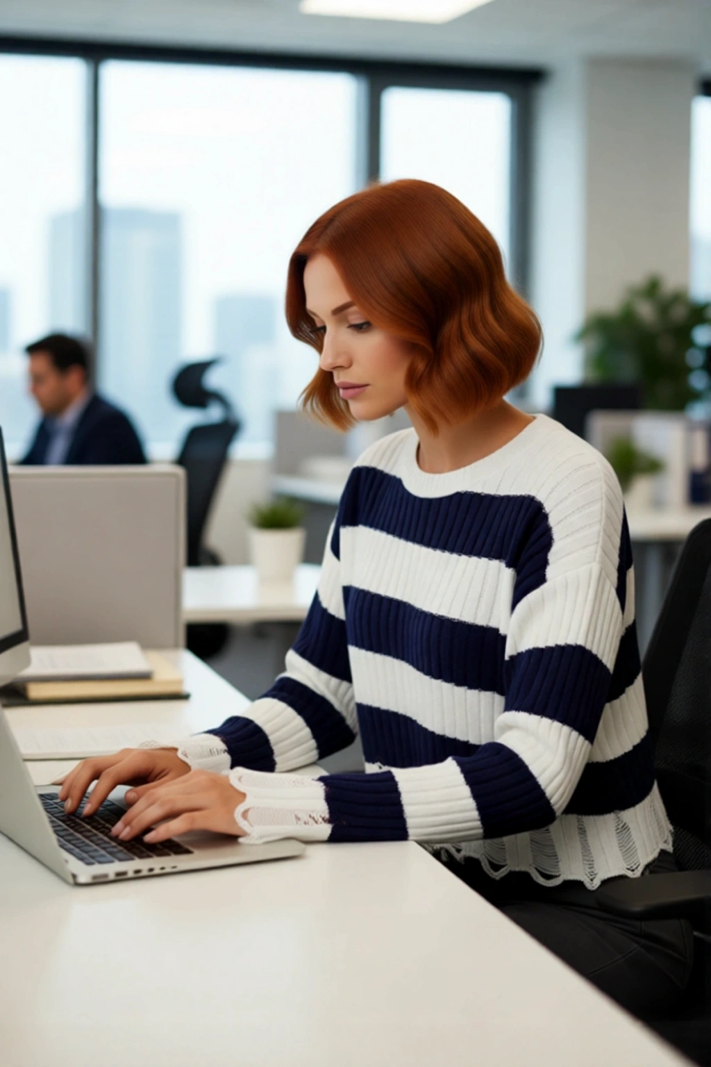 Bu kadın modern bisiklet yaka çizgili akrilik triko crop kazak, şık ve dinamik bir görünüm arayanlar için idealdir. Geniş ve rahat kalıbı, güncel moda trendlerine uyum sağlarken, %100 akrilik materyali sayesinde üstün yumuşaklık ve sıcaklık sunar. Ekru ve lacivert çizgili deseni, klasik denizci estetiğini çağdaş bir yorumla birleştirerek her türlü casual kombininize anında stil katıyor. Etek ucu ve kol manşetlerindeki akıtma detayları, ürüne benzersiz bir karakter ve özgün bir hava kazandırır.