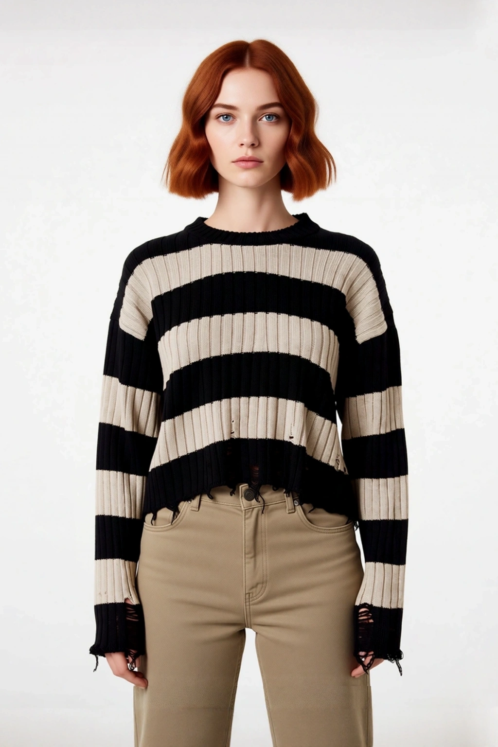 Ürün Özellikleri: Oversize kalıp, akrilik materyal, çizgili desen, bisiklet yaka, düşük kol, triko kumaş, ekru renk.