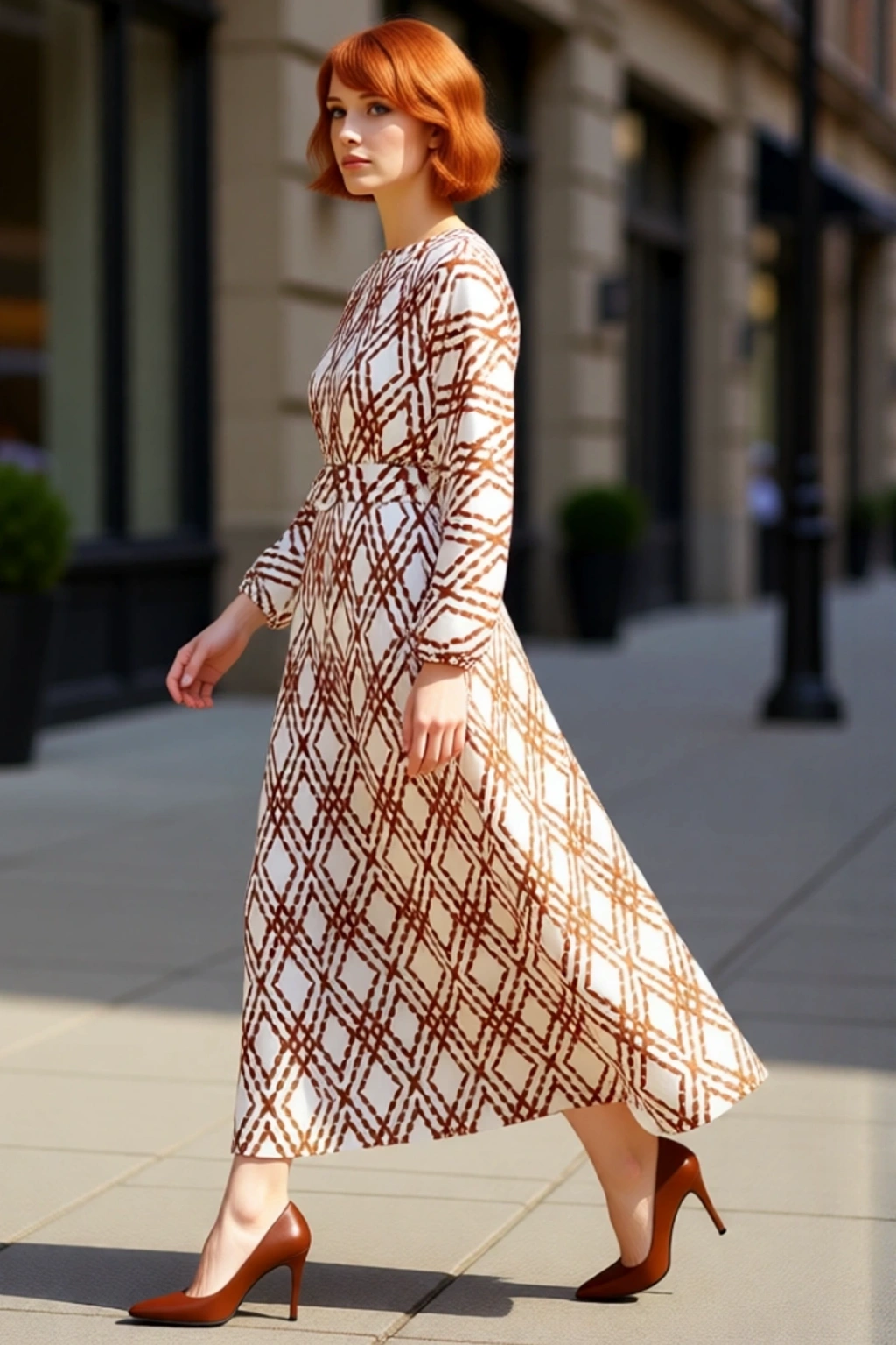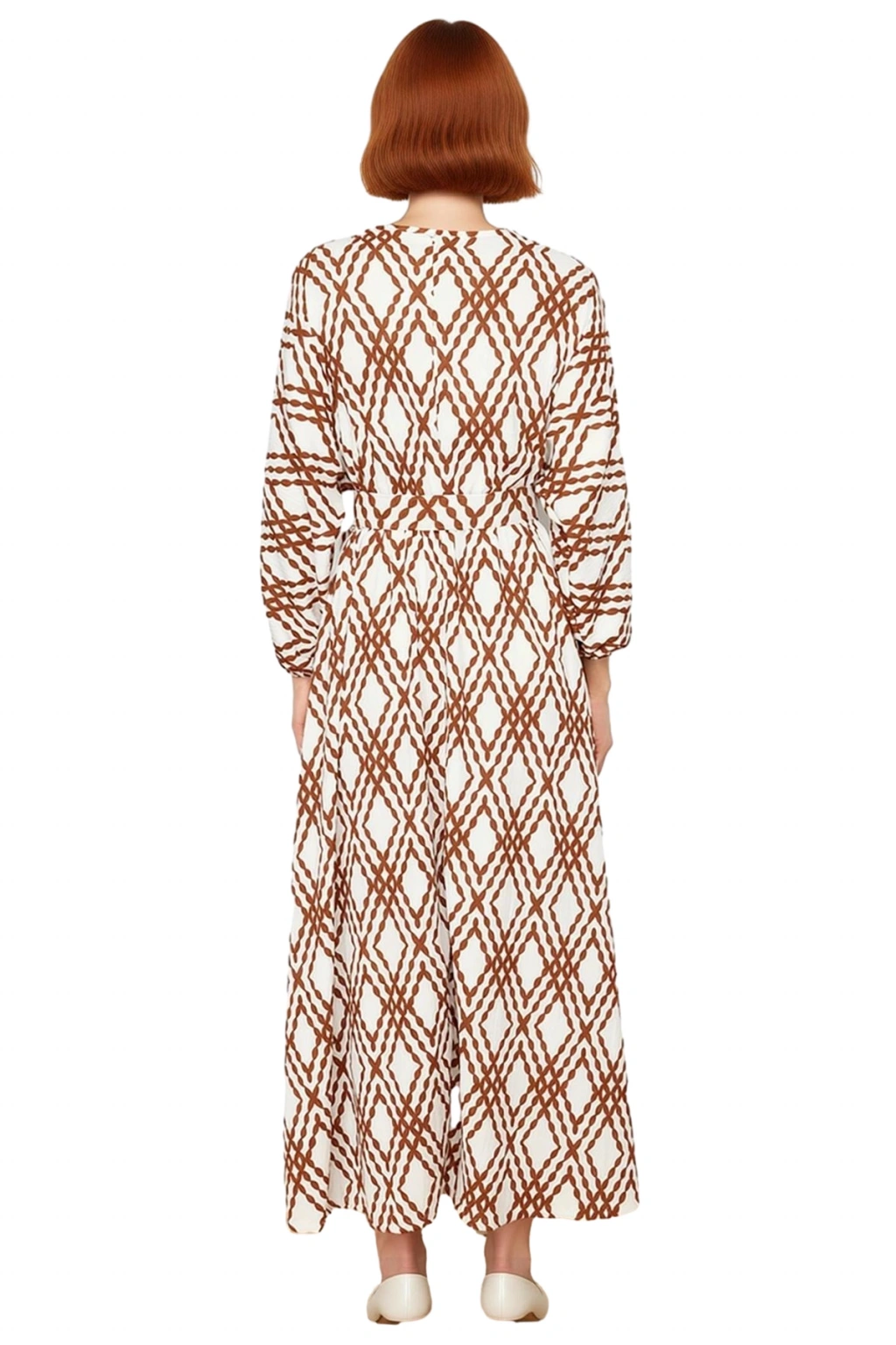 Ürün Özellikleri: Skater kalıp, %100 polyester materyal, geometrik desen, bisiklet yaka, uzun balon kol, dokuma kumaş, kahverengi renk, kemerli ürün detayı, maxi boy, crinkle dokuma, casual/günlük ortam.