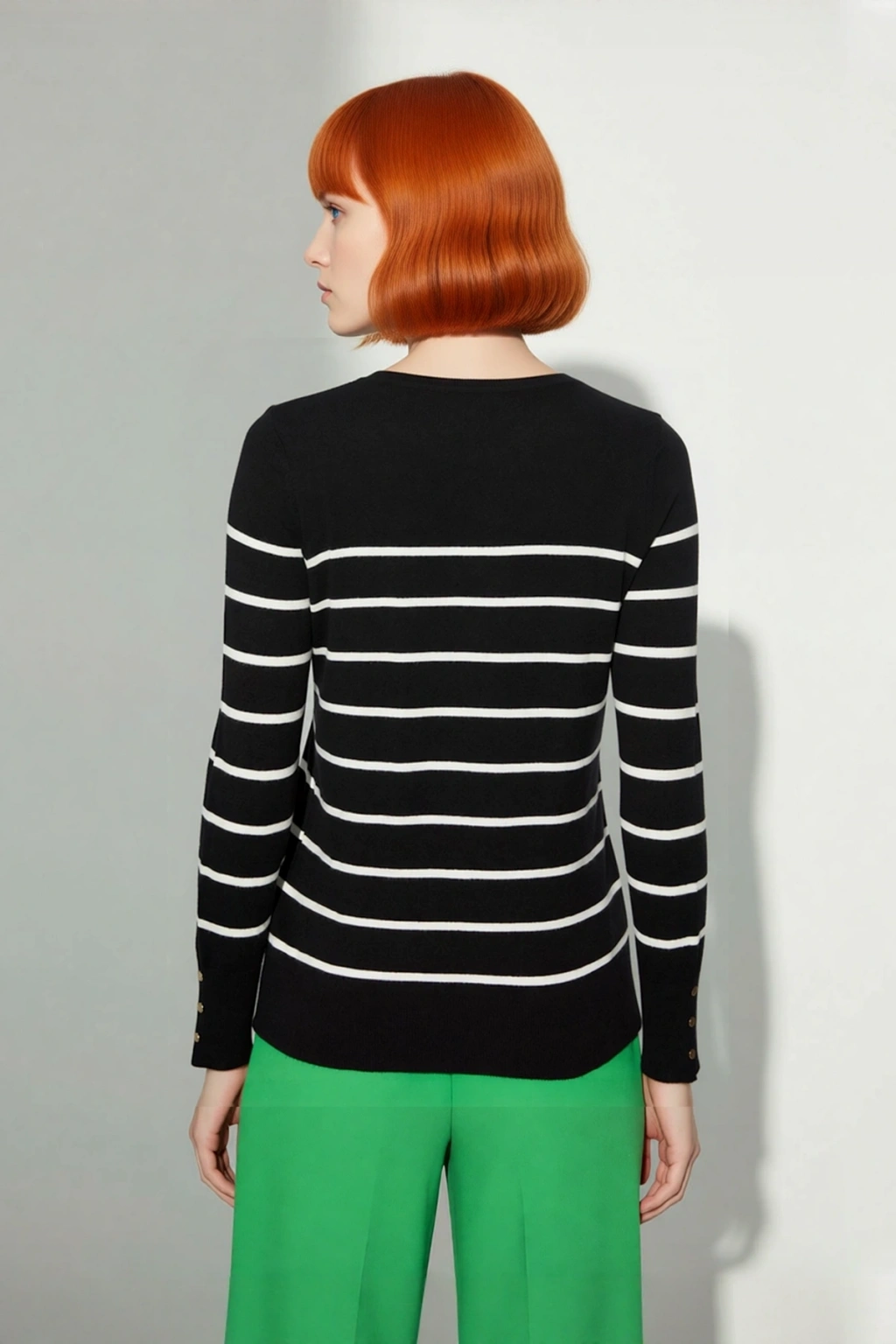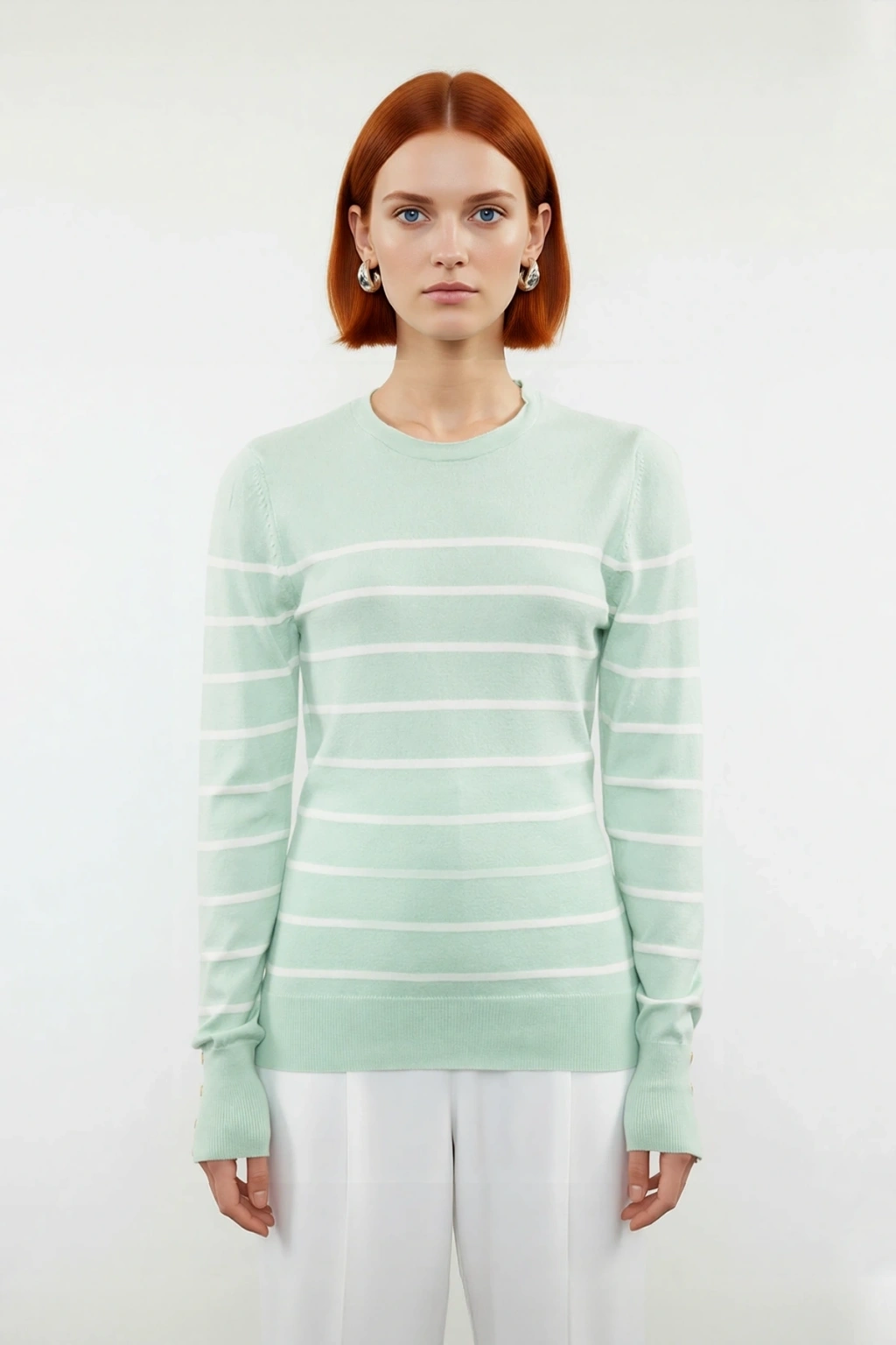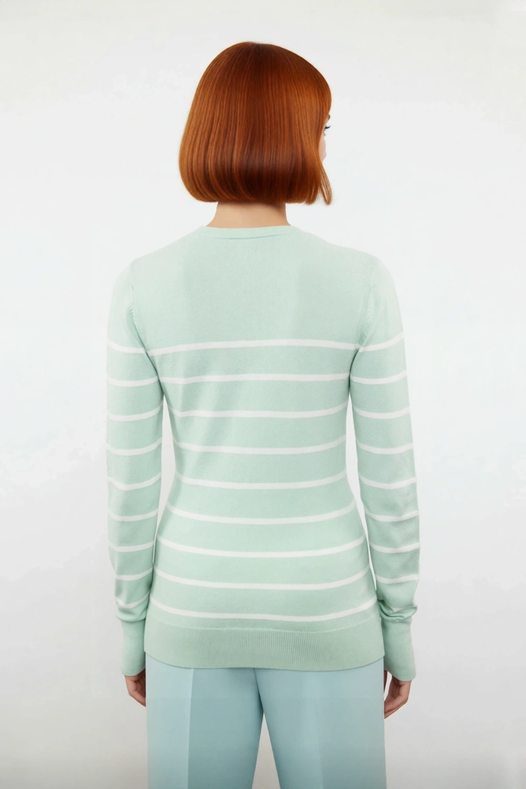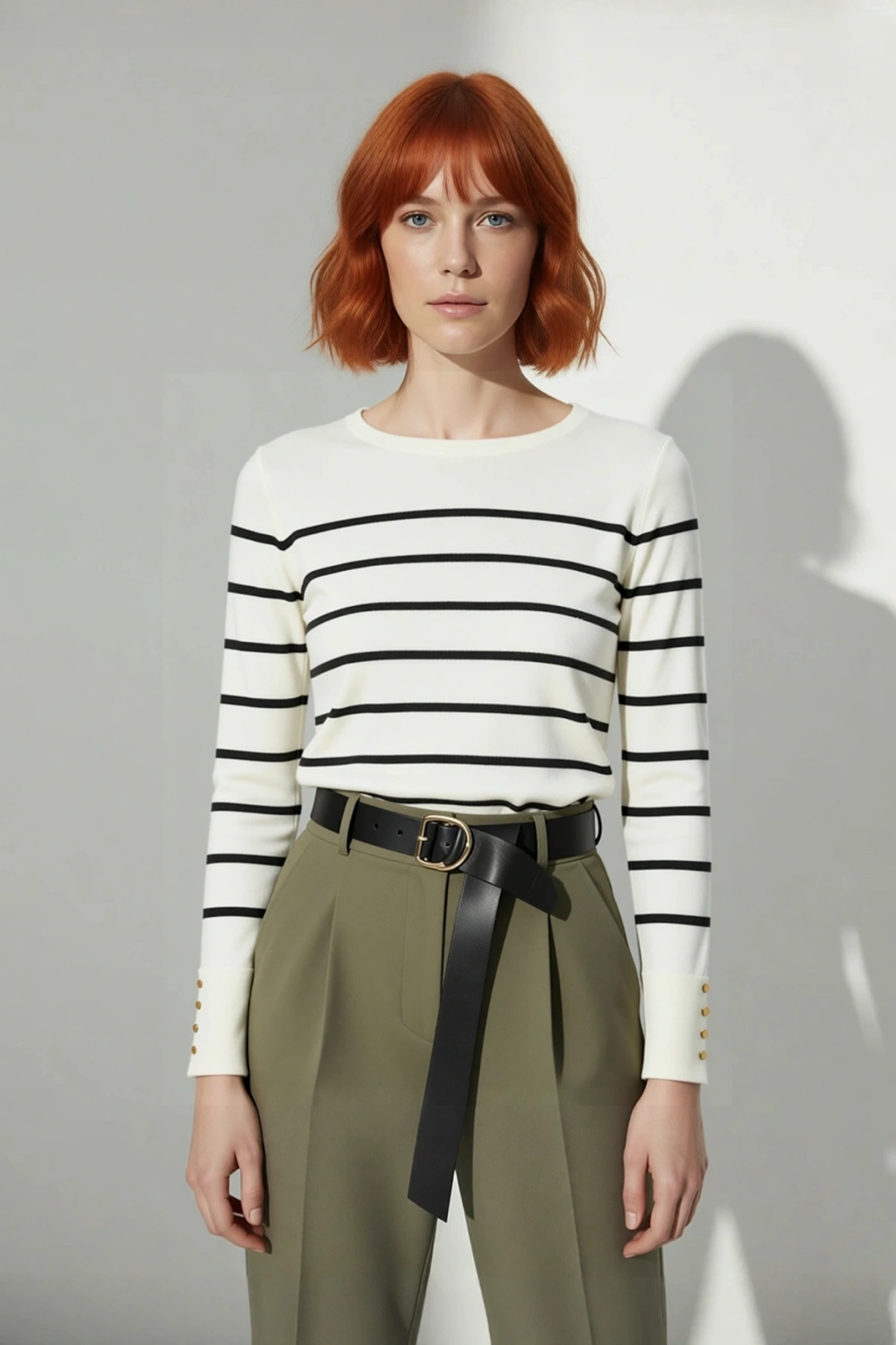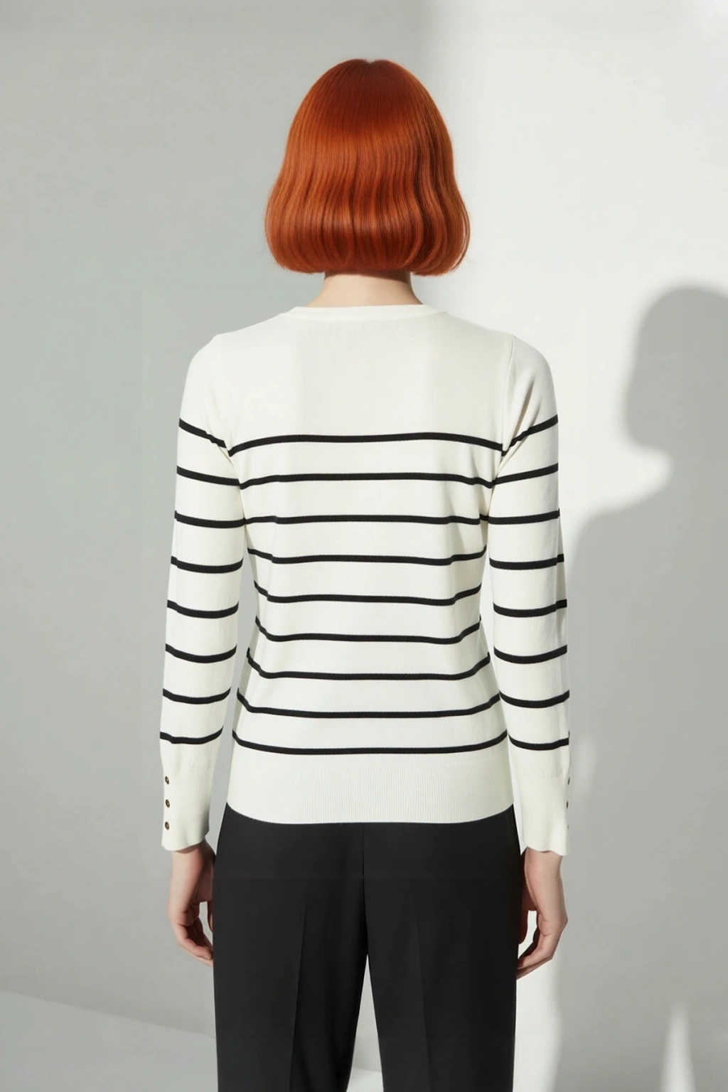 Ürün Özellikleri: Fitted kalıp, viskoz polyester poliamid materyal, çizgili desen, bisiklet yaka, standart kol, triko kumaş, ekru renk, baskısız tasarım.