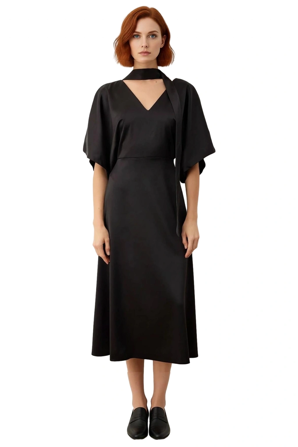 Ürün Özellikleri: Skater kalıp, polyester elastan materyal, düz desen, V yaka, yarasa kol, dokuma kumaş, siyah renk, fularlı tasarım.