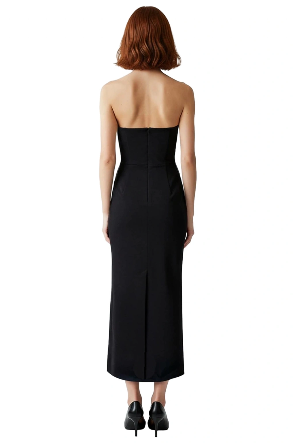 Bu midi boy abiye elbise, vücut hatlarını zarifçe ortaya çıkarırken, farklı vücut tiplerine de uyum sağlayacak esnekliğe sahiptir. Şık topuklu ayakkabılar ve uyumlu aksesuarlarla tamamlayarak kokteyl partilerinden özel yemek davetlerine kadar birçok etkinlikte kullanılabilir. Tüm sezonlarda kapalı mekanlardaki şık ve özel gece davetlerinizde stilinizi ön plana çıkarır, unutulmaz anlar yaşatır.