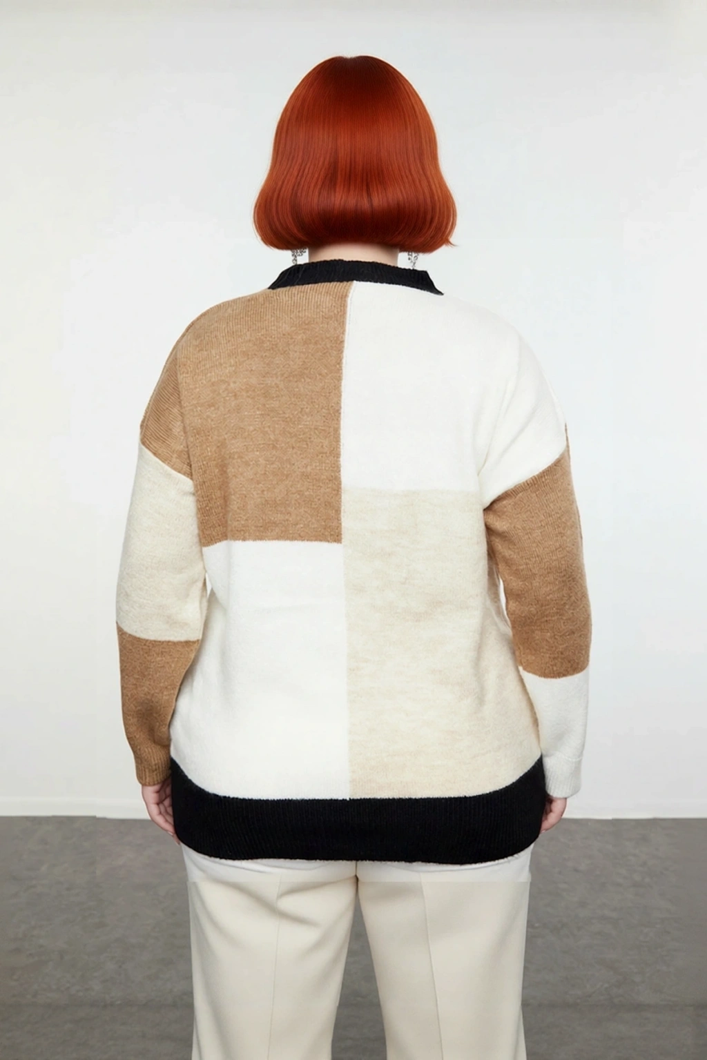 Ürün Özellikleri: Relaxed kalıp, 100% akrilik materyal, renk bloklu desen, bisiklet yaka, düşük kol, triko kumaş, çok renkli, baskısız tasarım.