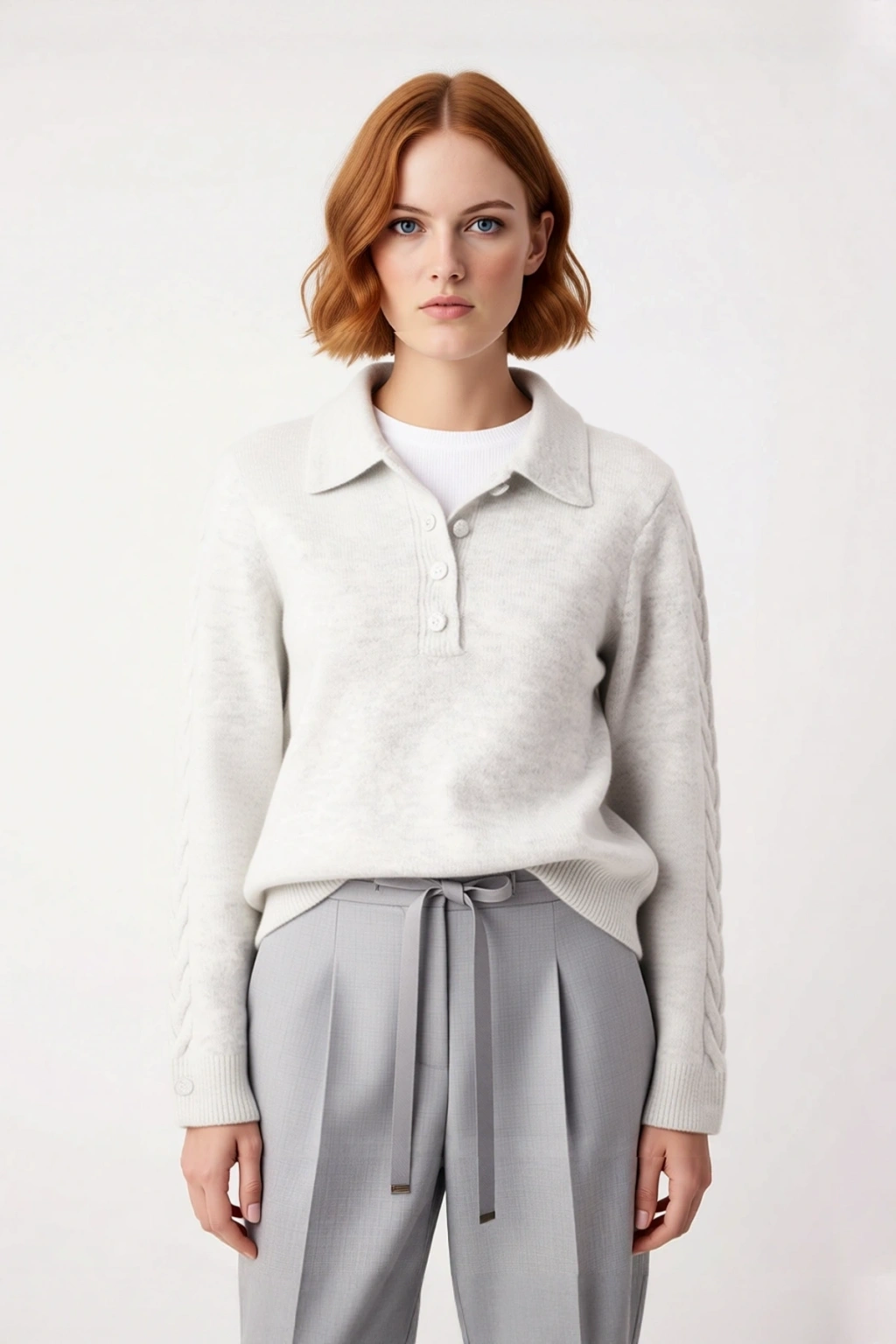 Ürün Özellikleri: Regular kalıp, akrilik polyester elastan materyal, saç örgü desen, polo yaka, standart kol, triko kumaş, gri renk, basic siluet.