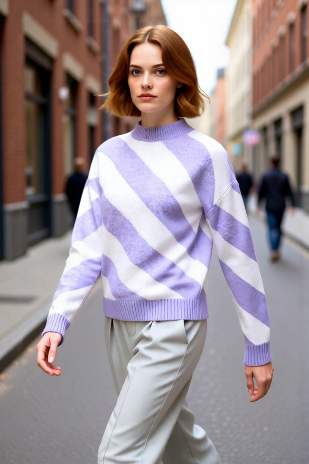 Bu Kadın Mor Çizgili Relaxed Fit Triko Kazak, soğuk kış günlerinde hem şıklığınızı hem de konforunuzu garanti altına alacak. Rahat kesimi sayesinde vücuda özgür bir duruş kazandırırken, mor ve beyazın uyumuyla oluşan çapraz çizgili deseni modern ve enerjik bir hava katar. Yüksek kaliteli 77% Akrilik ve 23% Polyester materyal bileşimi, soğuklara karşı etkili bir koruma sağlarken, cilde hoş gelen yumuşak dokusuyla gün boyu keyifli bir kullanım sunar. Basic silueti ve cepsiz tasarımı, sade şıklığı tercih edenler için ideal bir seçenektir.