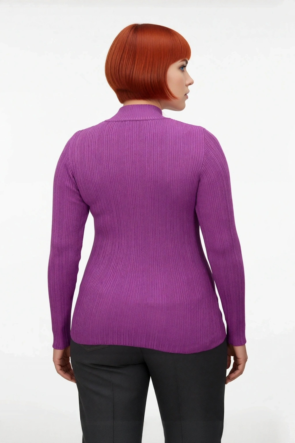 Ürün Özellikleri: Fitted kalıp, akrilik polyester materyal, düz fitilli desen, dik yaka, standart uzun kol, triko kumaş, mor renk, ince kalınlık, regular boy, casual kullanım.