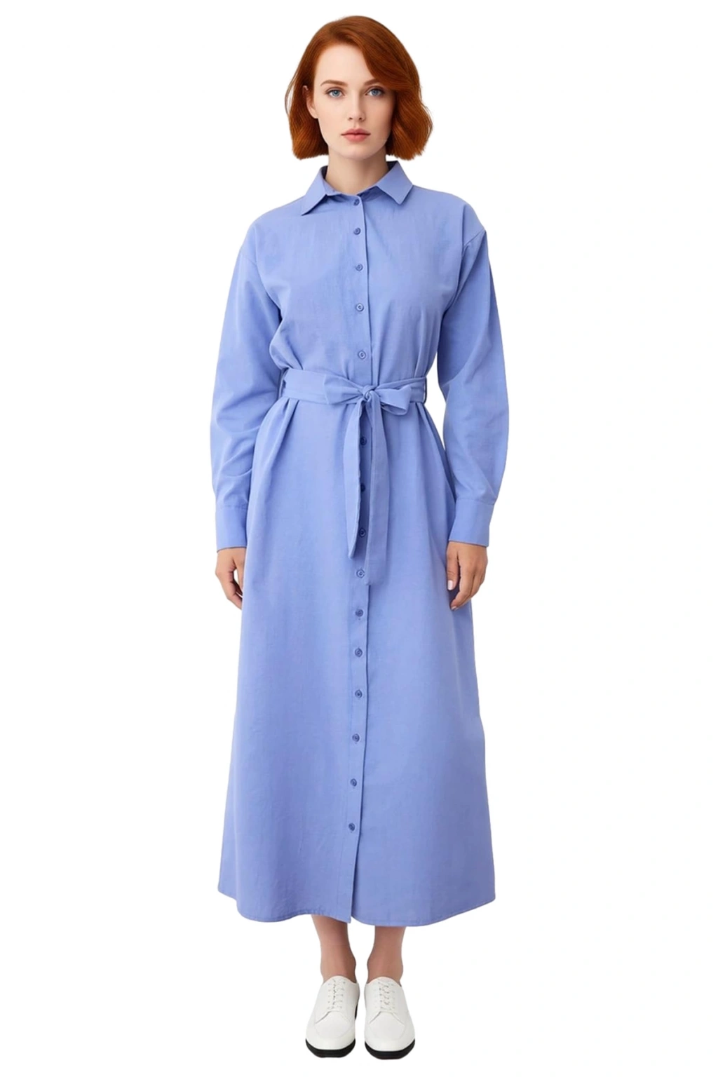 Ürün Özellikleri: Gömlek elbise kalıp, pamuk polyester materyal, düz desen, gömlek yaka, standart kol, dokuma kumaş, lila renk, kuşaklı kemer.