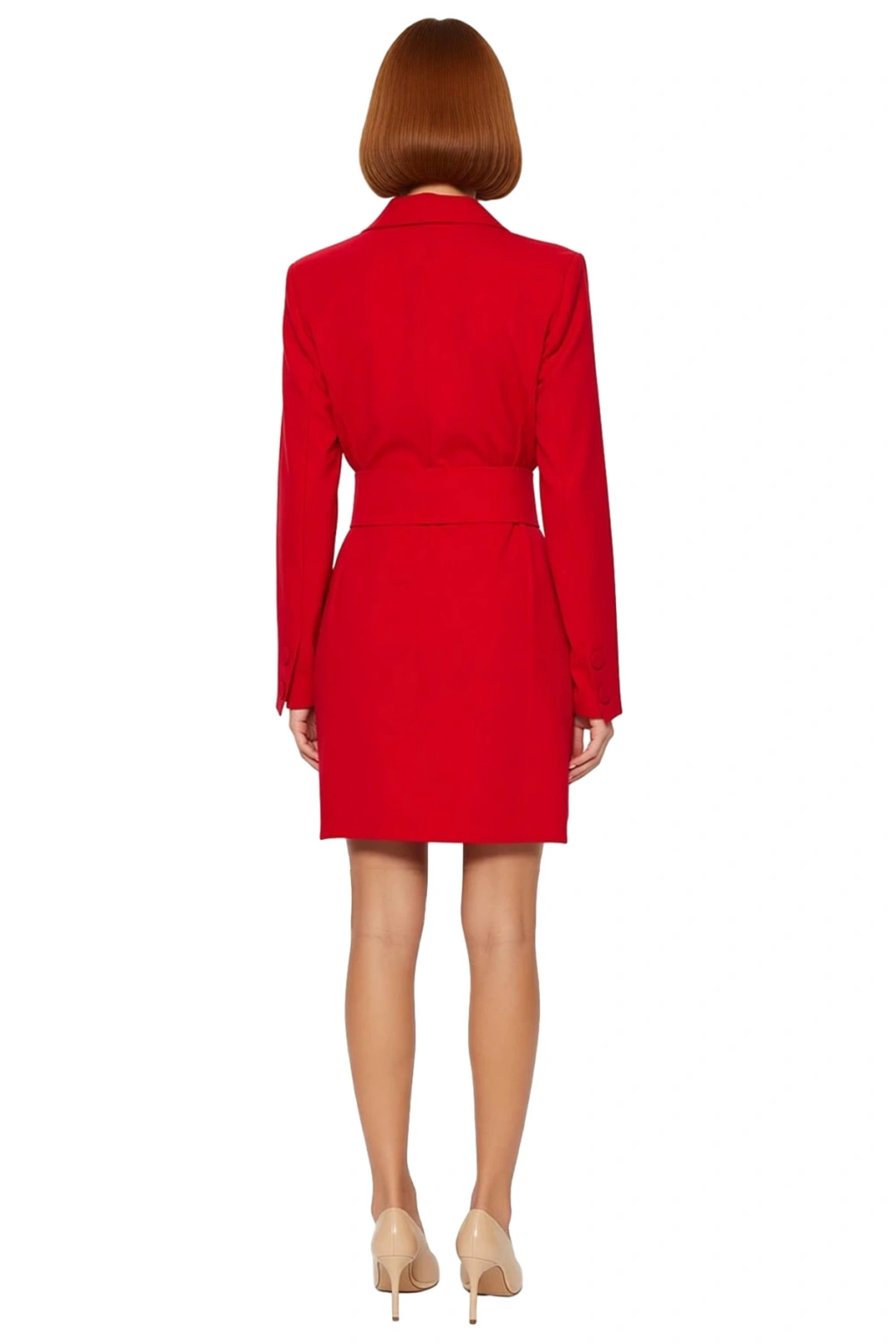 Ürün Özellikleri: Ceket elbise kalıp, polyester karışımlı materyal, düz desen, ceket yaka, uzun standart kol, dokuma kumaş, kırmızı renk, kemerli detay.
