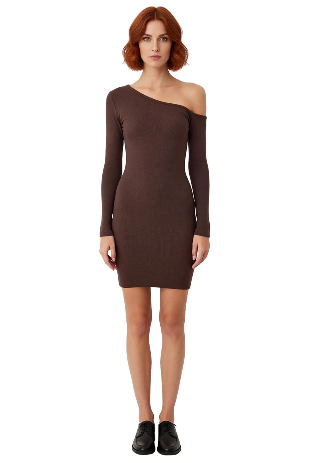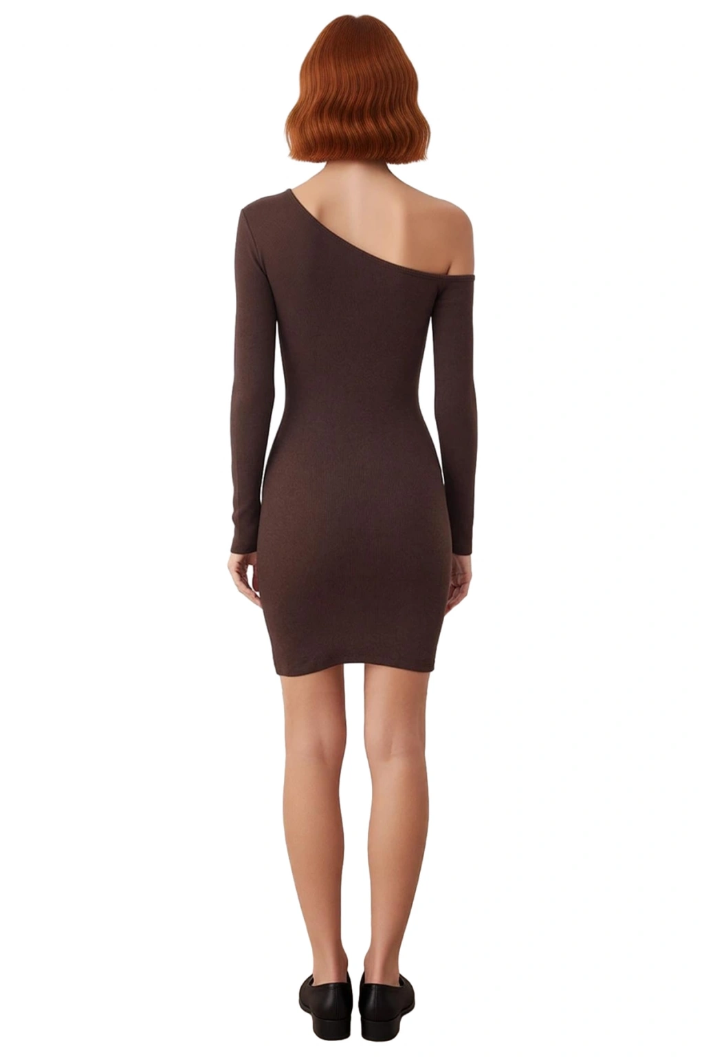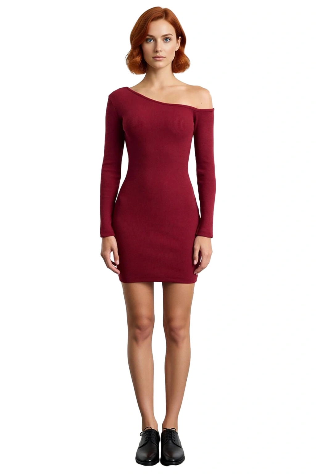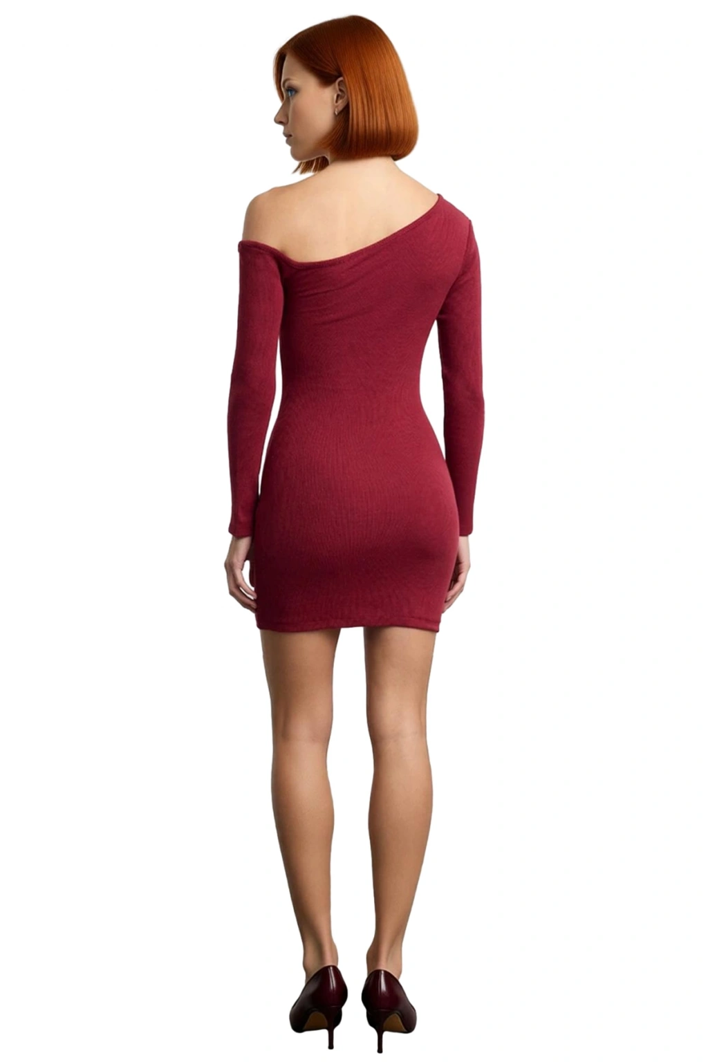 Ürün Özellikleri: Bodycon kalıp, pamuk polyester materyal, düz desen, asimetrik yaka, uzun düşük kol, örme kaşkorse kumaş, bordo renk, astarsız tasarım.