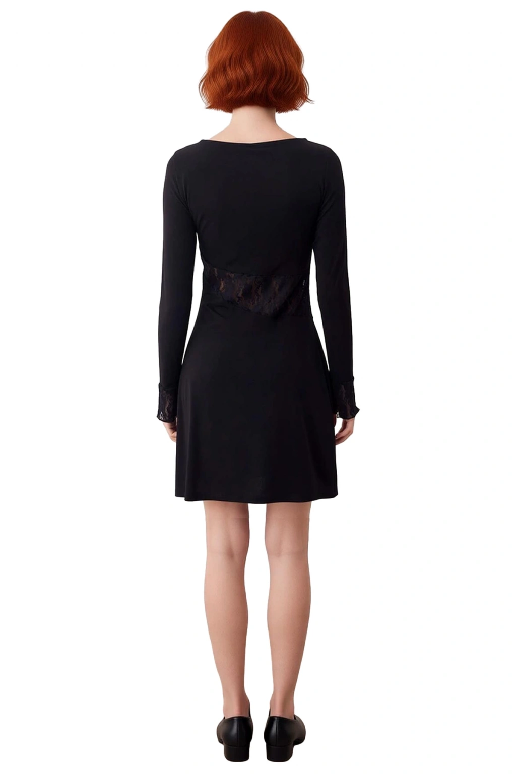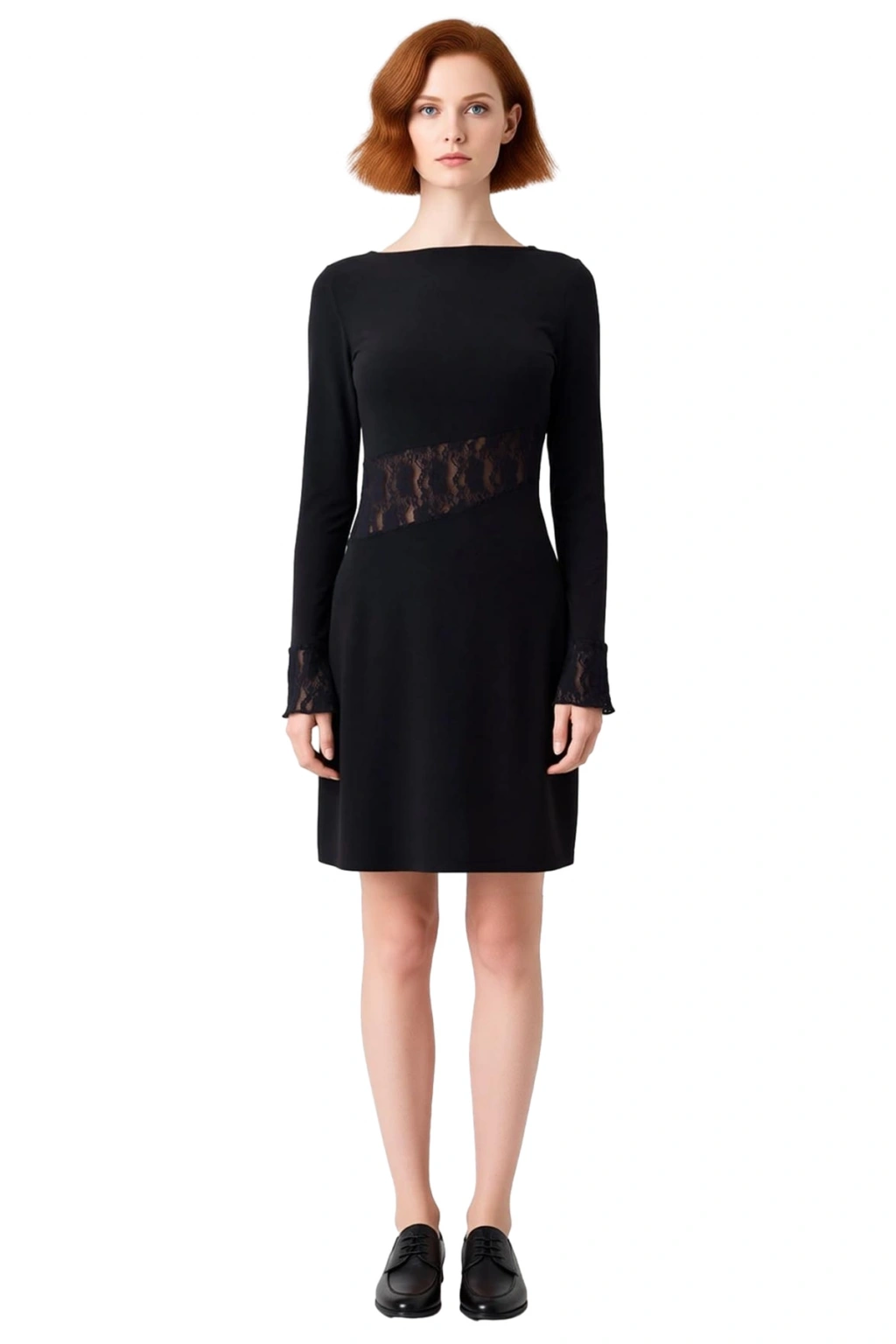 Ürün Özellikleri: Bodycon kalıp, polyester-elastan materyal, düz desen, kayık yaka, standart kol, örme kumaş, siyah renk, dantel detaylı tasarım.