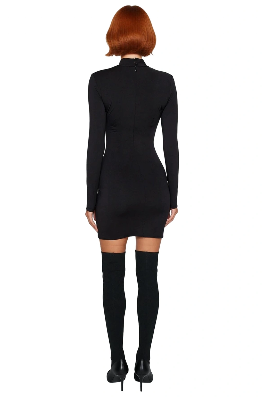 Ürün Özellikleri: Bodycon kalıp, polyester karışımlı materyal, düz desen, dik yaka, uzun standart kol, örme kumaş, siyah renk, kemersiz tasarım.
