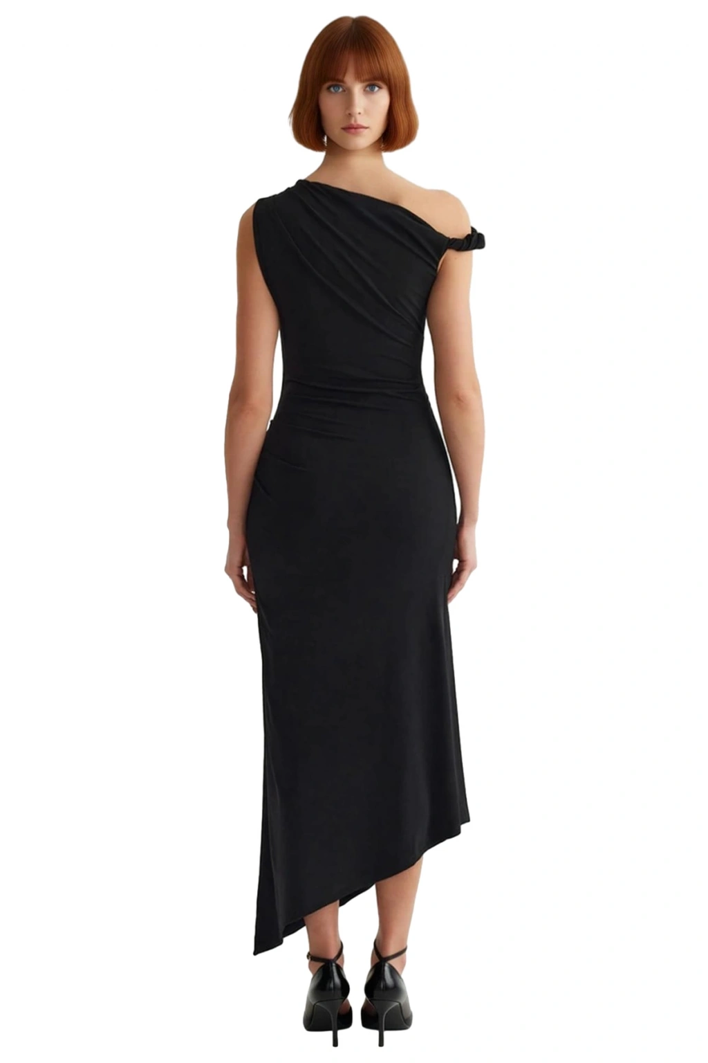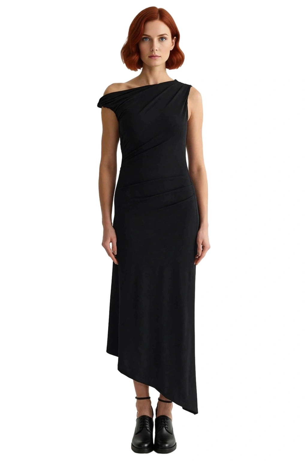 Ürün Özellikleri: A-line kalıp, polyester materyal, düz desen, asimetrik yaka, kolsuz kol, örme kumaş, siyah renk.
