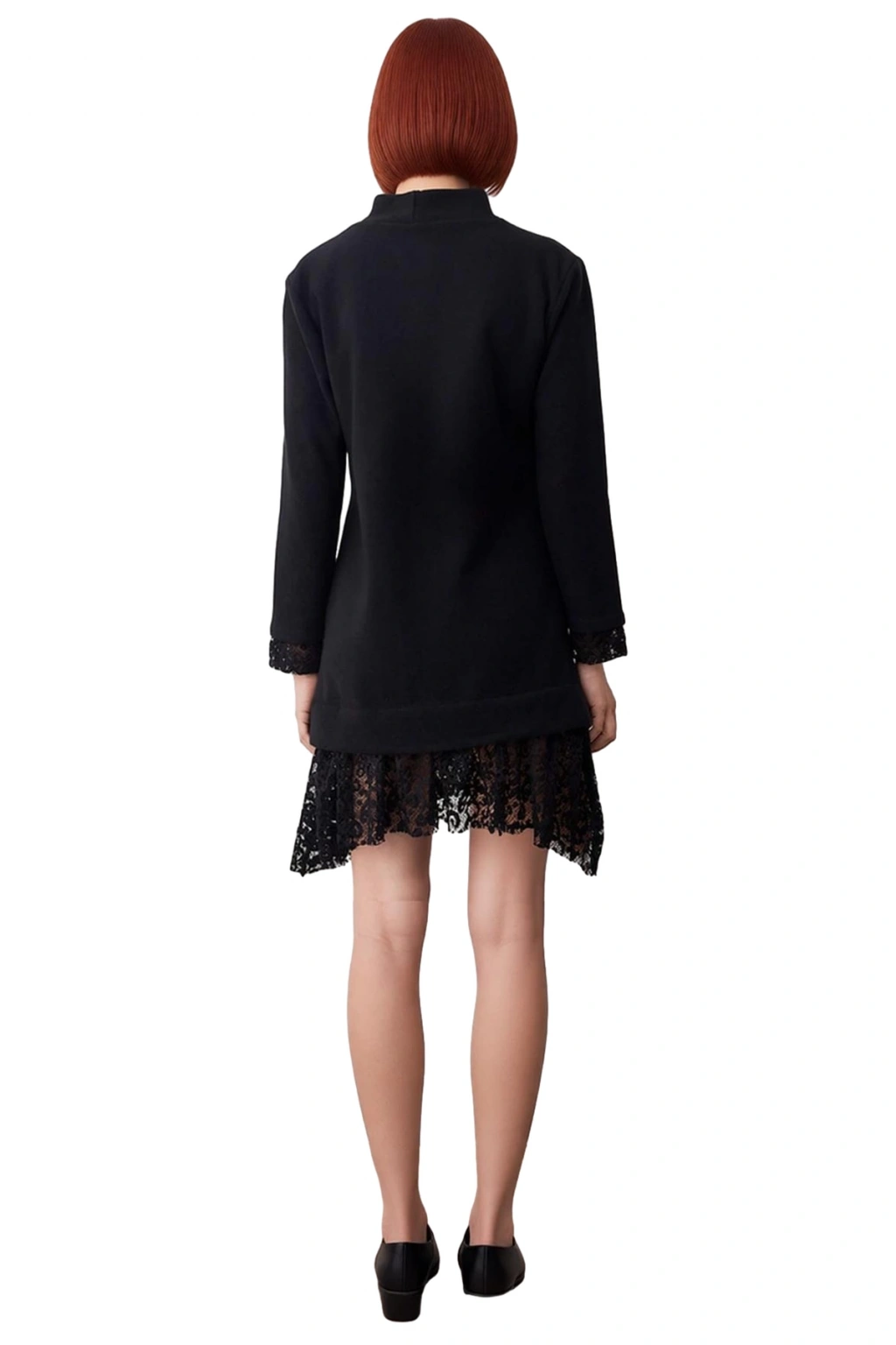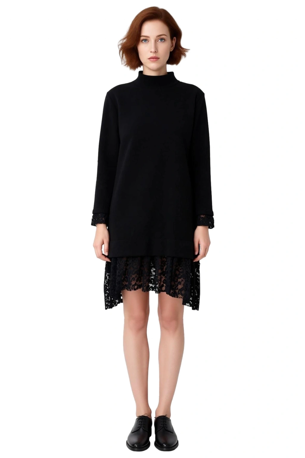 Dik yaka tasarımı, elbiseye modern bir hava katarken aynı zamanda soğuktan korunma sağlar. Standart kol yapısına sahip uzun kolları, rahat bir oturuş sunarak gün boyu konforu garantiler. Örme kumaş tipi ve Selanik dokuma özelliği, yumuşak bir dokunuş hissi verirken, esnek yapısı ile vücuda uyum sağlar. Astarsız oluşu, elbiseyi daha hafif ve nefes alabilir kılar. Kısa / mini boyu, genç ve enerjik bir görünüm sağlarken, dantel detaylarıyla zenginleşen etek ucu, hareketli ve çekici bir bitiş sunar. T10 yıkama talimatı sayesinde kolayca temizlenebilir ve uzun ömürlü kullanım sunar.
