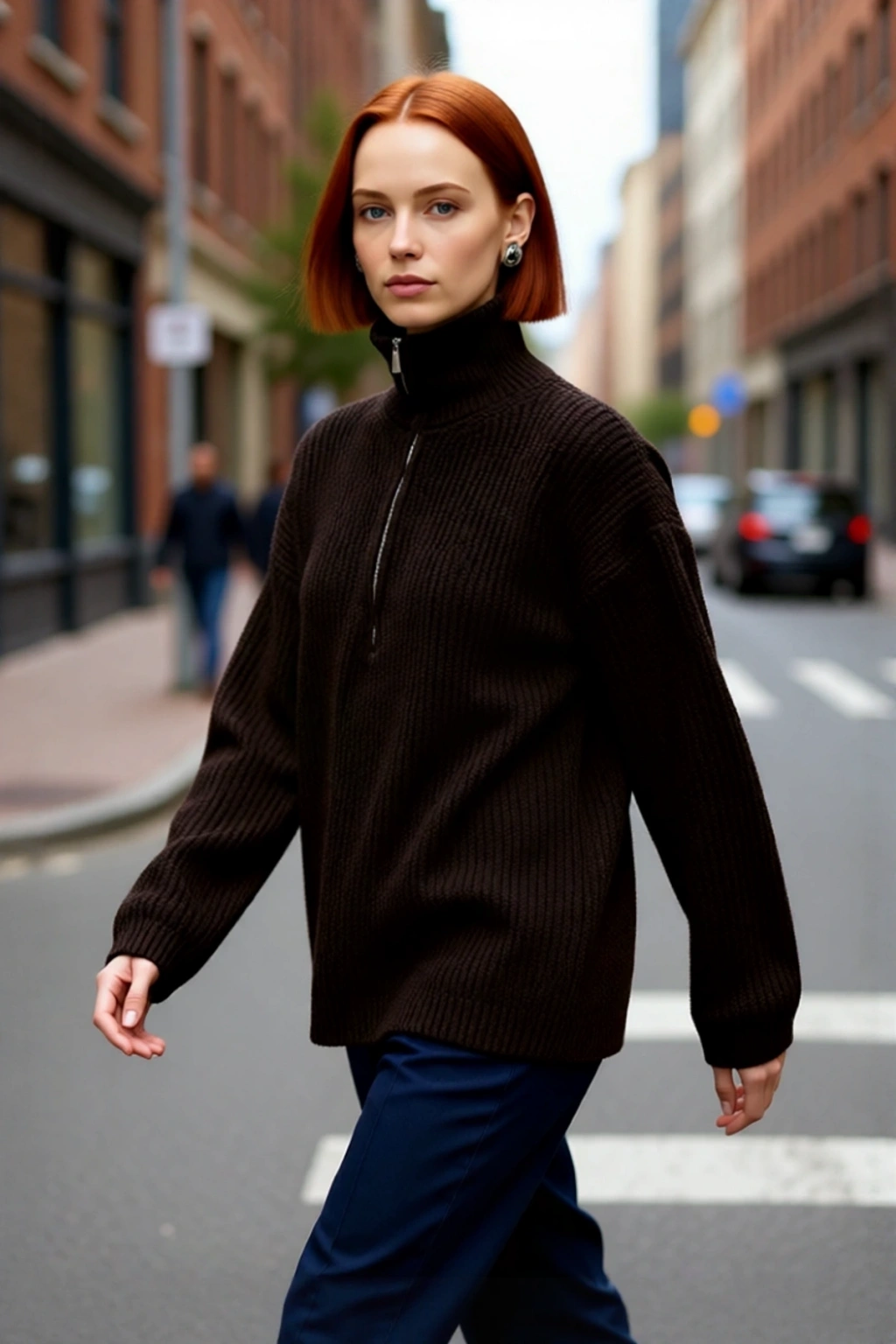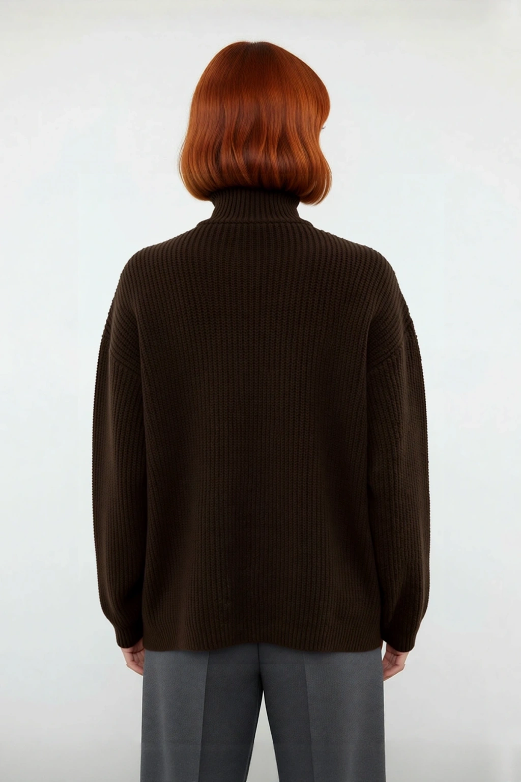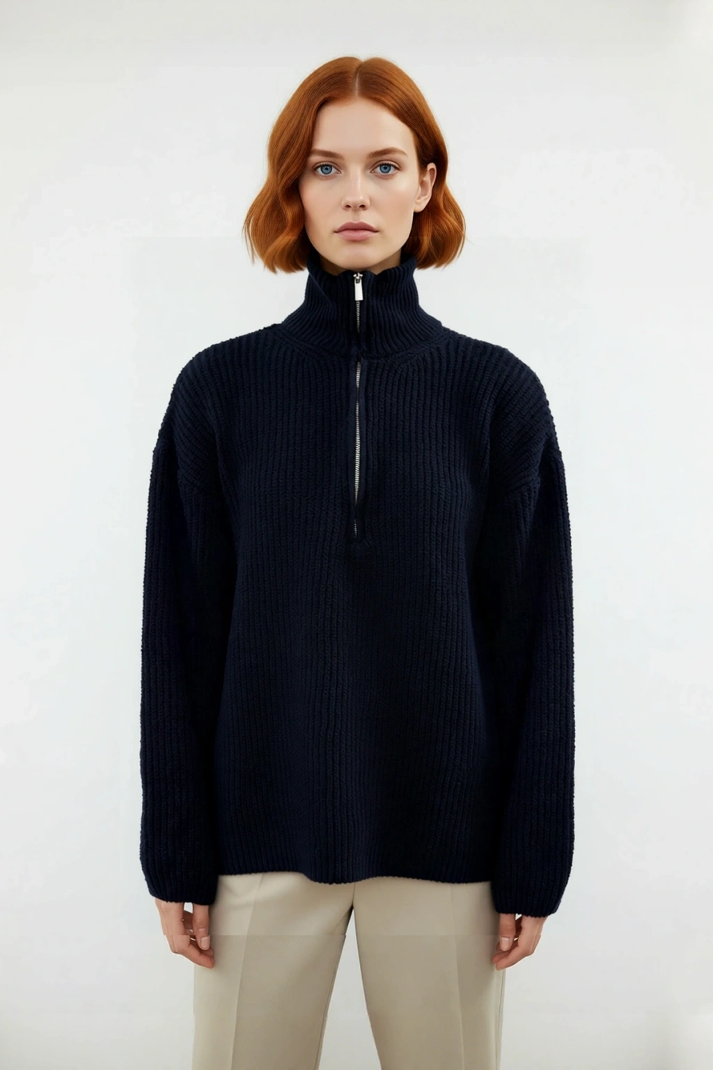 Kazağın dik yaka tasarımı, soğuktan korunmanıza yardımcı olurken, görseldeki yarım fermuar detayı ürüne modern bir dokunuş katar ve kullanım kolaylığı sağlar. Uzun kol boyu ve düşük omuz kesimi, hem rahat bir giyim deneyimi sunar hem de güncel moda trendlerine uyum sağlar. Orta kalınlıktaki triko kumaş yapısı, kış ve sonbahar aylarında sizi sıcak tutarken, nefes alabilen dokusu sayesinde gün boyu ferahlık hissi verir. Basic silueti, farklı vücut tiplerine kolayca adapte olarak herkese hitap eder. Sürdürülebilir üretim süreçleriyle çevreye duyarlı bir seçenek sunar.