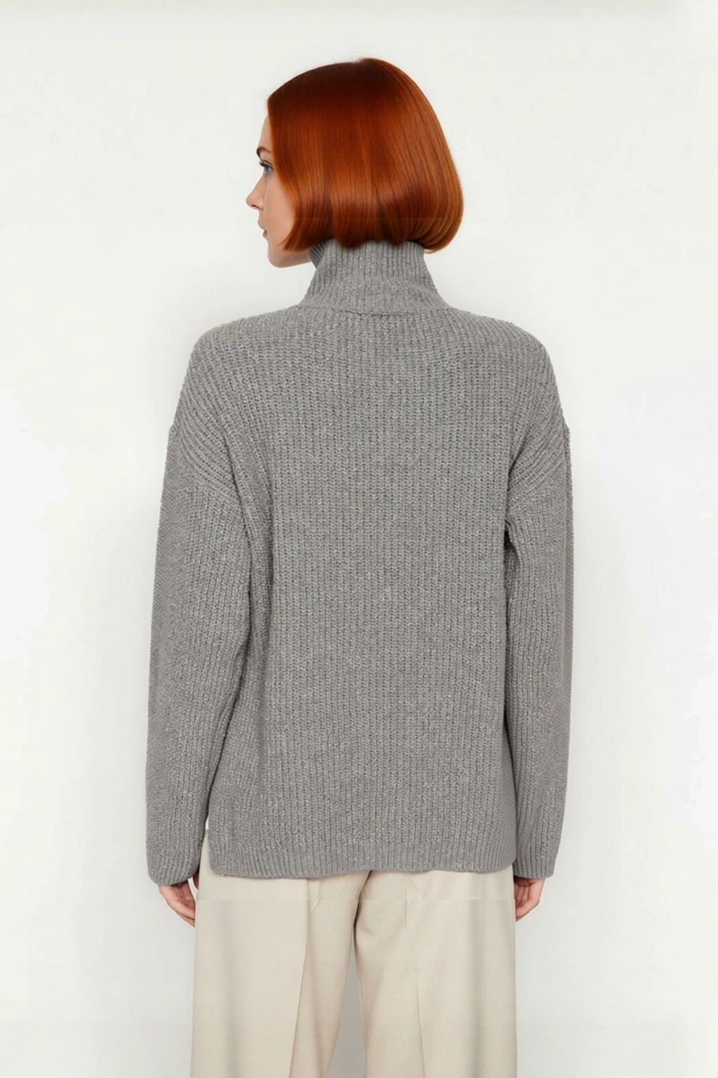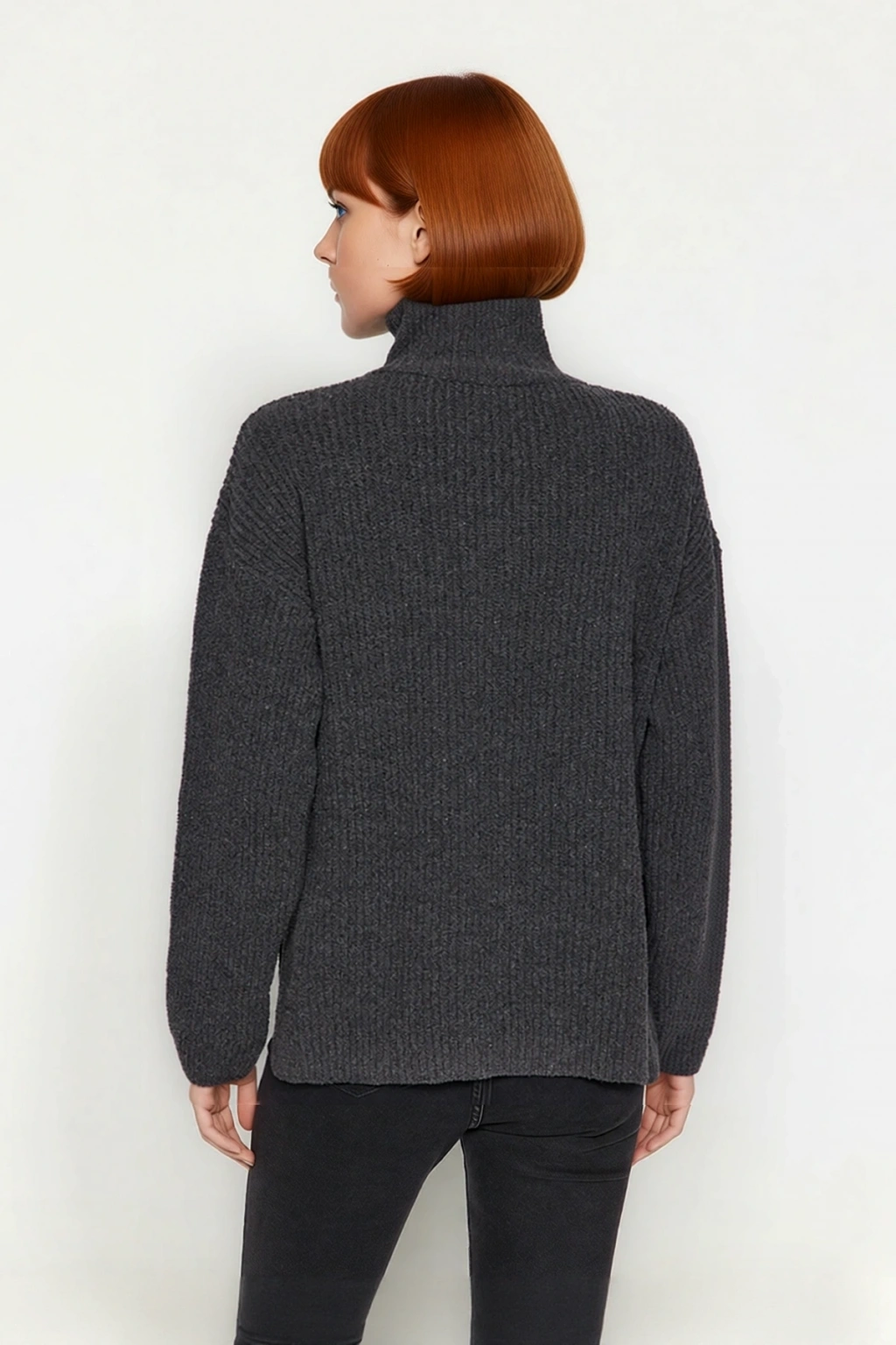 Bu modern ve işlevsel kadın triko kazak, orta kalınlığı sayesinde serin havalar için ideal bir seçimdir. Düşük kol tipi ve regular kesimiyle vücuda zarif bir şekilde oturarak rahatlık ve şıklığı bir araya getirir. Selanik dokuma tekniğiyle üretilen bu özel parça, triko kumaşın doğal esnekliğini ve yumuşaklığını en iyi şekilde yansıtır. Yüksek kaliteli polyester ve pamuk karışımı materyali, cildinize dost bir dokunuş sunarken, düz antrasit rengi her türlü kombinle kolayca uyum sağlar. Gardırobunuzun temel parçalarından biri olmaya adaydır.